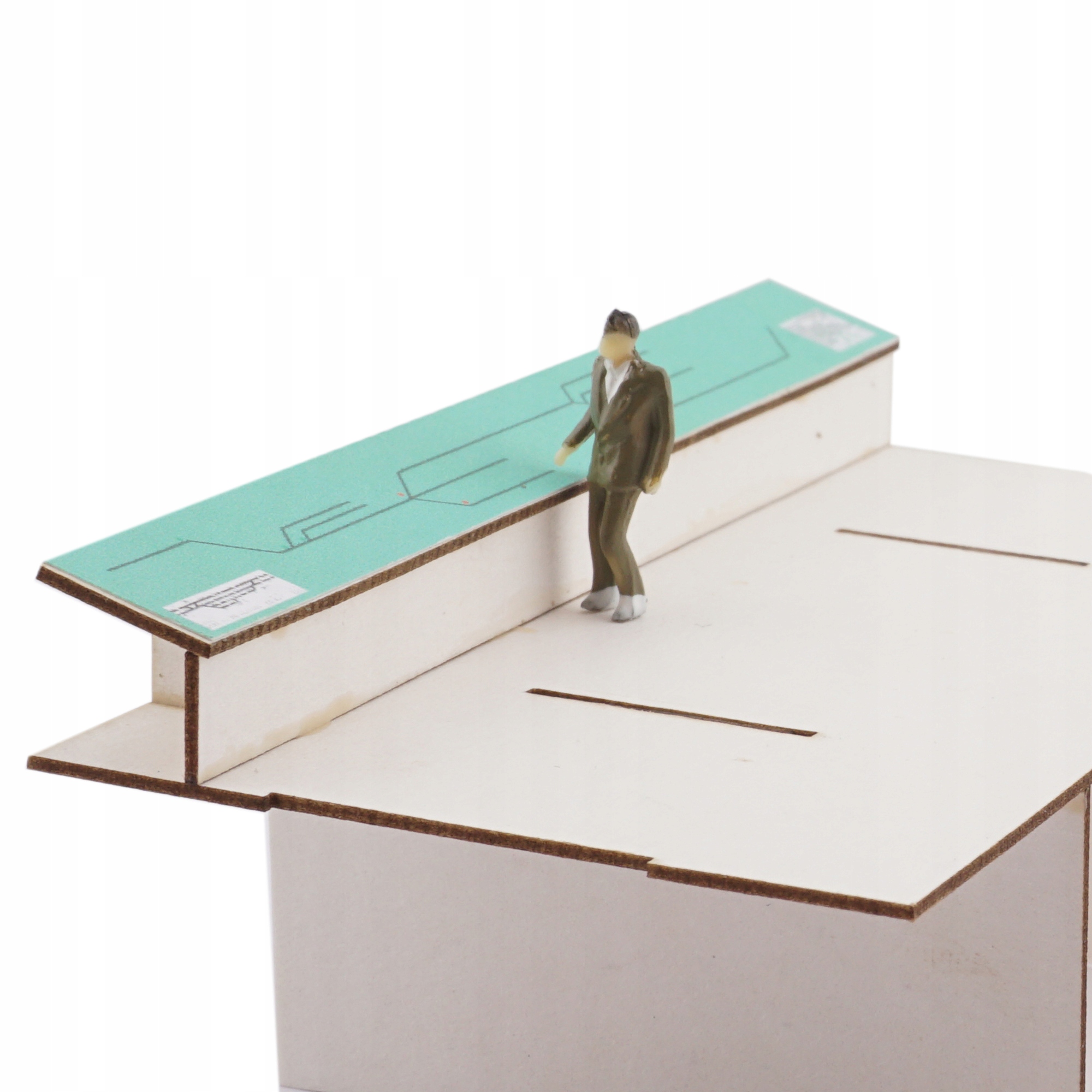 Model wykonany z tektury modelarskiej o grubości 1,5 oraz 1 mm wycinany laserowo, wrażliwy na wilgoć. Do klejenia zaleca się używanie uniwersalnych klejów. Ciemne krawędzie to naturalny efekt obróbki materiału.