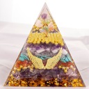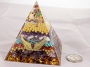 Piramidka orgonitowa z Ametystem, Agatem Białym, Turkusem, Jaspisem Czerwonym, Awenturynem Zielonym, Miedzianym Drzewkiem, Białym Kryształem i symbolem Złote Skrzydła Anioła.