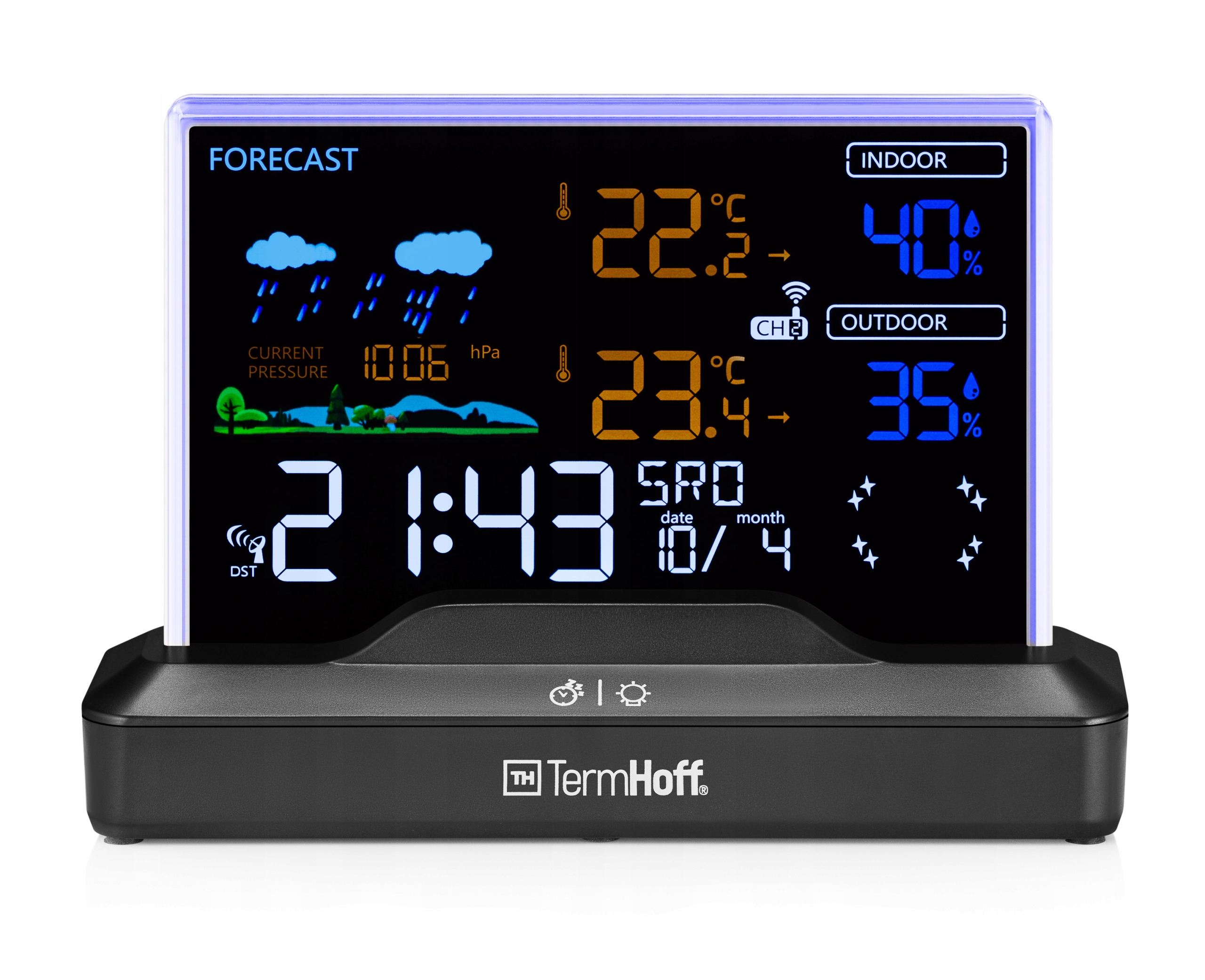 Bezprzewodowa stacja pogodowa TermHoff TH-WS2 z barometrem oraz dodatkowym czujnikiem: mierzy temperaturę wewnętrzną i zewnętrzną oraz przewiduje lokalną prognozę pogody, co czyni go idealnym wyborem do uzyskiwania dokładnych pomiarów dostępnych za jednym spojrzeniem na czytelnym wyświetlaczu.