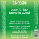 Balsam do stóp przeciw poceniu BINGOSPA zawiera wosk pszczeli, mentol, cynk, wazelinę. Odświeża skórę stóp, zmniejsza pocenie się stóp i hamuje rozwój bakterii powodujących przykry zapach.
