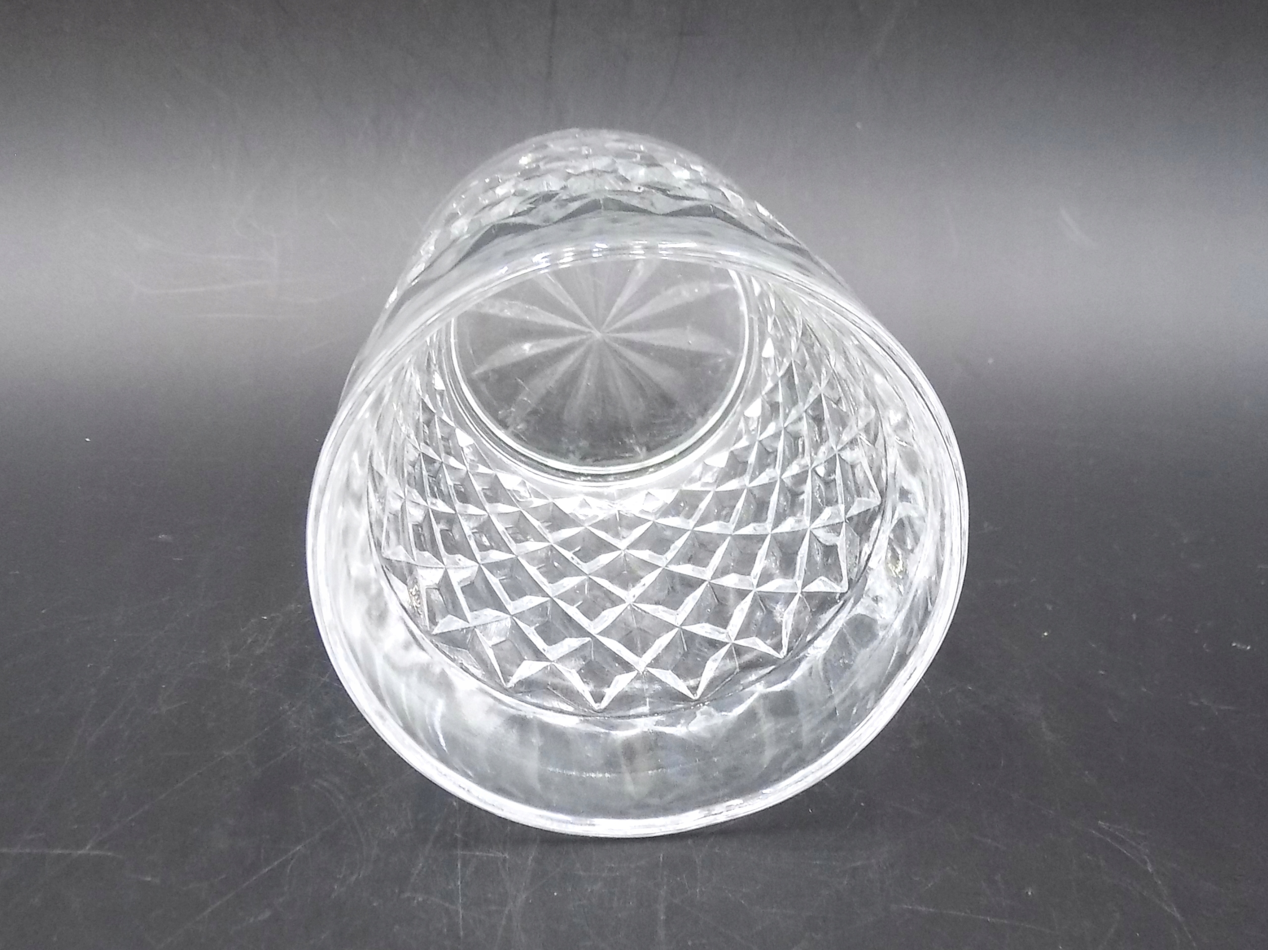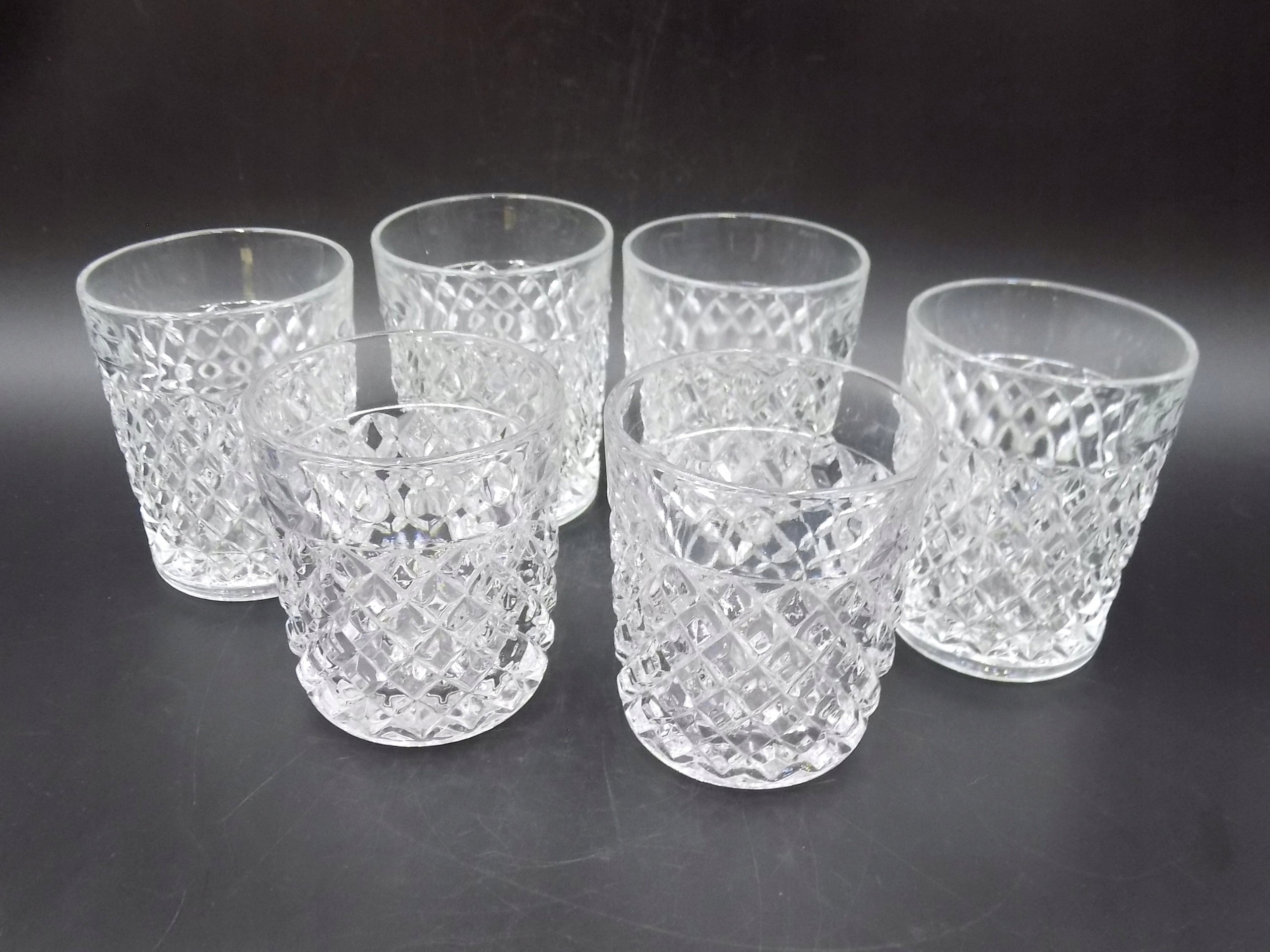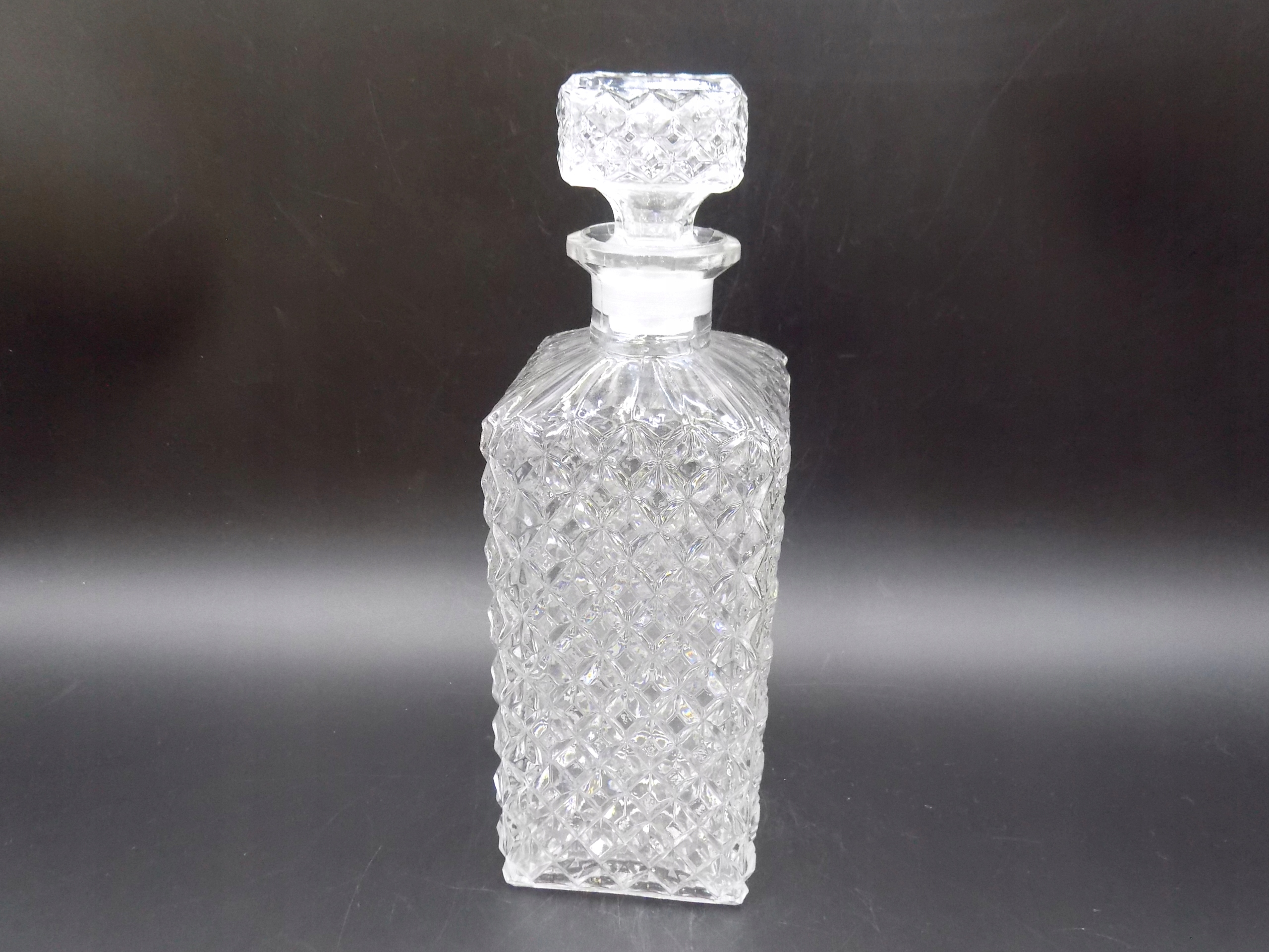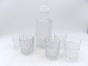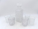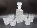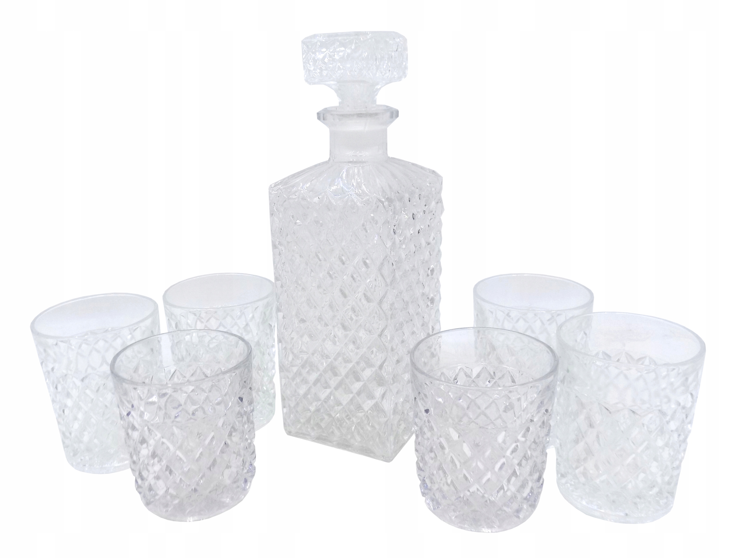 Dekoracyjna karafka wykonana ze szkła bezbarwnego w zestawie z sześcioma szklankami prawdopodobnie z okresu PRL. Zestaw z lat 70/80-tych prawdopodobnie z Czechosłowacji. Stan przedmiotu pokazano na zdjęciach. Dwie szklanki w nieco innym odcieniu i mniejsze. Wymiary; wys. karafka 25 x 8,5 x 8,5 cm, szklanki 9 x 7,5 oraz 8,5 x 7,5.