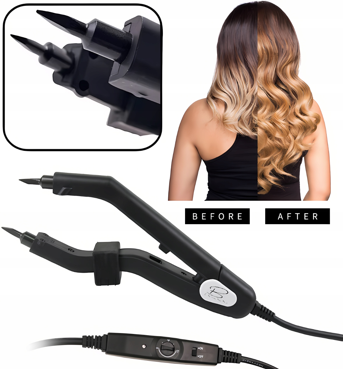 Posiada wyprofilowane szczypce, dzięki czemu możesz samodzielnie formować pasma, przedłużać włosy (naturalne i syntetyczne).