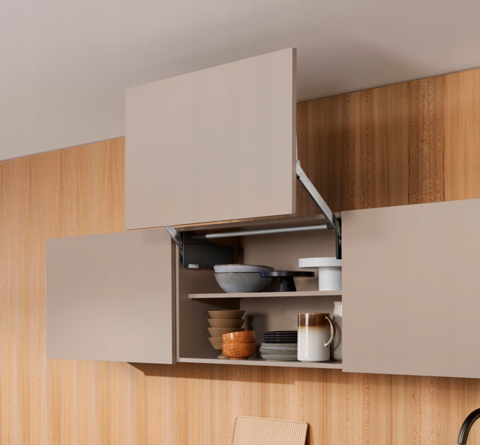 AVENTOS HL TOP jest podnośnikiem do pojedynczych frontów, który unosi front równolegle do przedniej krawędzi korpusu.