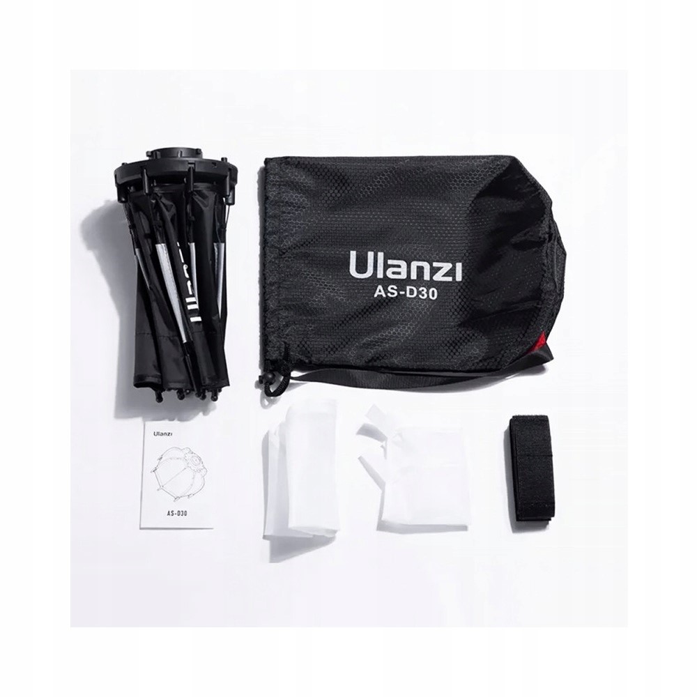 Oktagonalny softbox Ulanzi AS-D30 o średnicy 30 cm to kompaktowych rozmiarów modyfikator światła przeznaczony do lampy LED LT028 40 W i wykorzystujący mocowanie Mini Bowens. W komplecie z czaszą znajdują się dwa dyfuzory – wewnętrzny i zewnętrzny – oraz grid. Całość przechowywana jest w solidnym futerale.