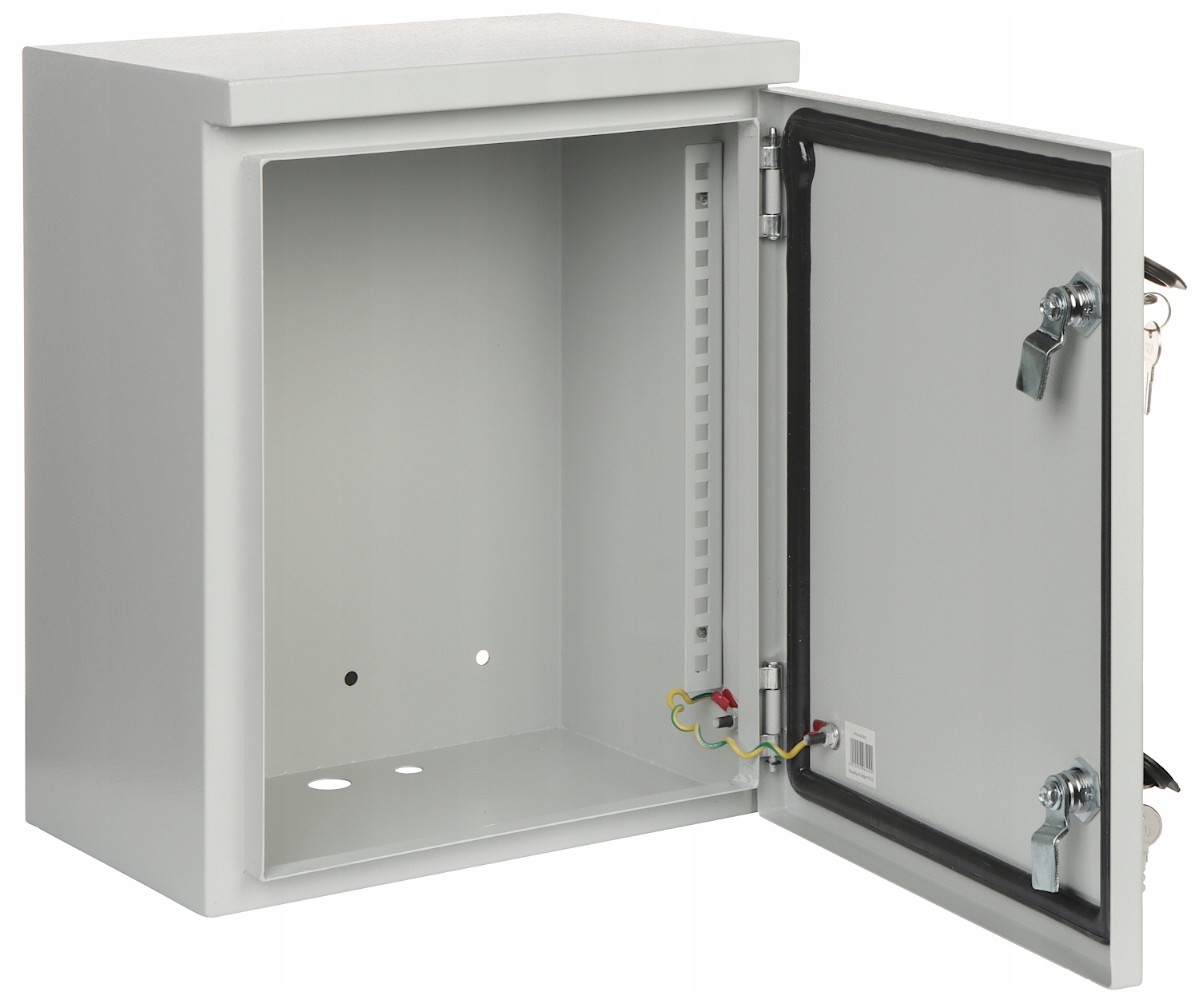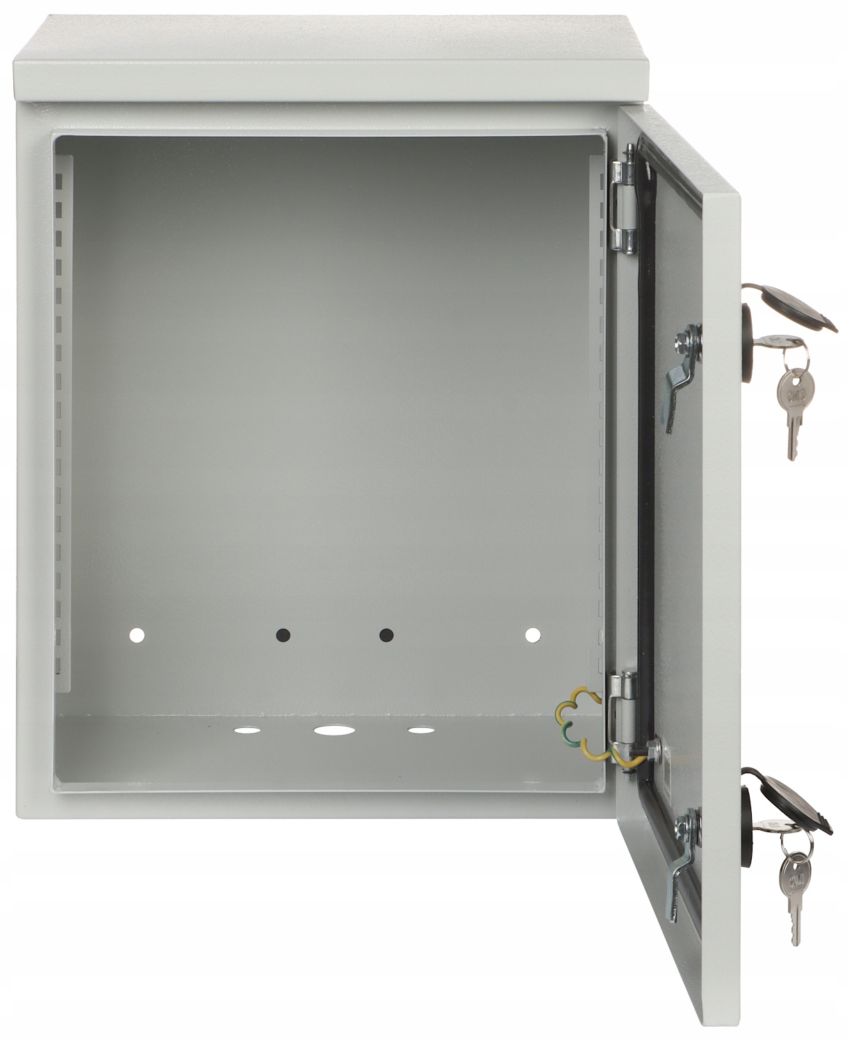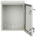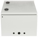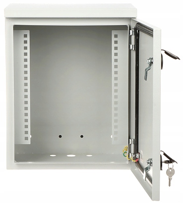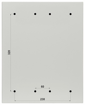Szerokość wewnętrzna: 285 mm / 10 " Wysokość wewnętrzna: 6 U Głębokość wewnętrzna: 210 mm Szerokość zewnętrzna: 335 mm Wysokość zewnętrzna: 420 mm Głębokość zewnętrzna: 235 mm Otwory na wentylatory: Kolor: Jasny szary Zdejmowany panel tylny: Drzwi: Drzwi prawe z gumą uszczelniającą Wybrane cechy: Otwory na przewody od dołu : 2 x Ø 16 mm + 1 x Ø 24 mm 2 hermetyczne zamki Grubość blachy : 1 mm Klasa szczelności - IP65, Klasa odporności mechanicznej - IK10 Mocowanie - Do ściany Szyny do montażu Rack są łatwo wyjmowane