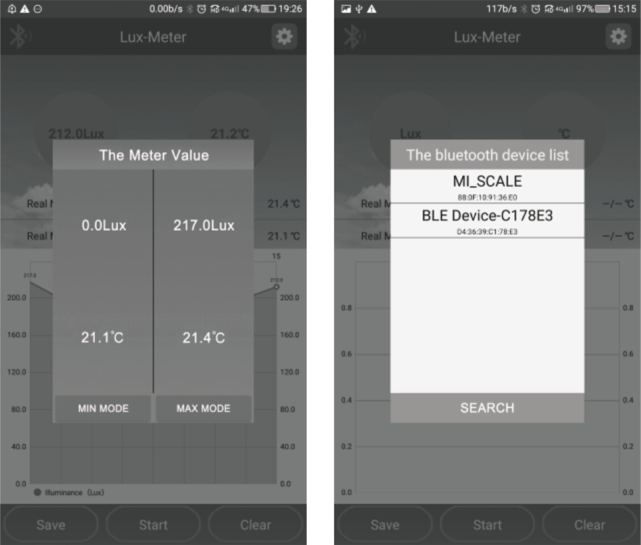 Funkcją łączności BLUETOOTH oraz aplikacja na system Android 5.0 i wyższy umożliwia zapisywanie i analizowanie wyników pomiarów natężenia oświetlenia w aplikacji mobilnej.