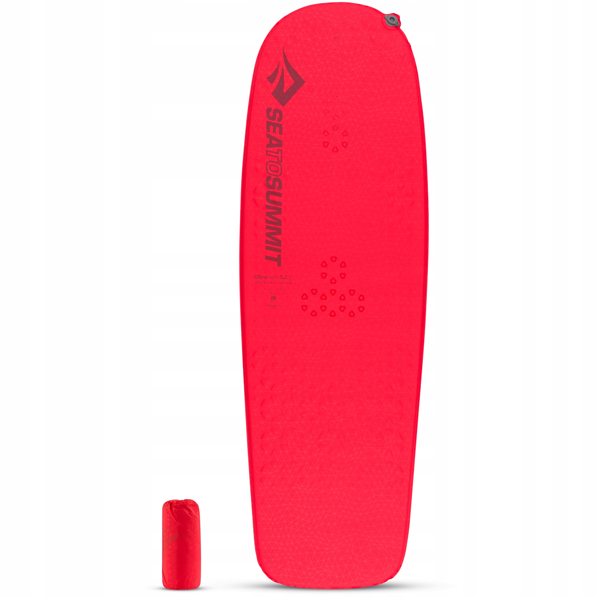 Mata samopompująca Sea To Summit Ultralight S.I.Self Inflating czerwona zaprojektowana z myślą o kobietach. Zastosowana technologia Delta Core-V, usuwa wystarczającą ilość pianki, aby zmniejszyć wagę i objętość ale nie pogarsza trwałości i komfortu użytkowania. Technologia ta pozostawia wystarczającą ilość pianki aby zapewnić ciepło. Model ten posiada skonstruowane strefy ciepła w okolicy bioder i tułowia, aby zapewnić dodatkowe wsparcie i izolację dla kobiety podróżującej z plecakiem, która chce zachować lekkość swojego bagażu.