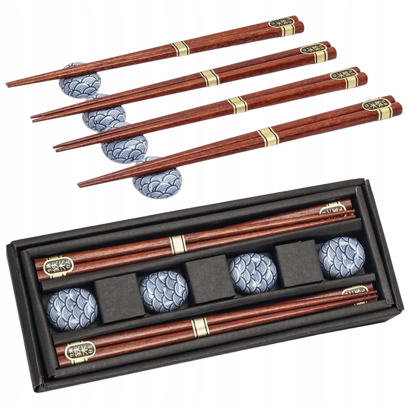 Opis: Zestaw eleganckich japońskich bambusowych pałeczek z podstawką z motywem orientalnej fali. Komplet zapakowany jest w eleganckie pudełko idealnie nadające się na prezent. W opakowaniu znajdują się 4 pary lakierowanych ciemny drewnianych bambusowych pałeczek o długości 22,5cm. Pałeczki zdecydowanie urozmaicą spożywanie orientalnych potraw, idealnie nadają się na prezent dla bliskiej osoby.