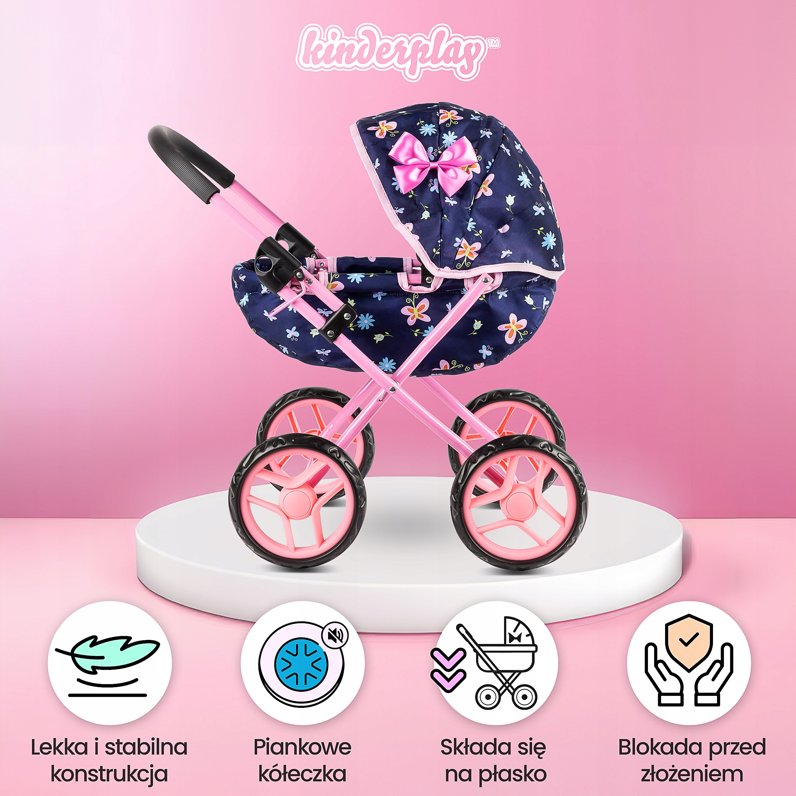 Wózek dla lalek marki Kinderplay to urocza zabawka, która z pewnością przypadnie do gustu wielu dziewczynkom. Prezentuje się w klasycznej stylistyce, zachwycając atrakcyjną kolorystyką. Jego solidna konstrukcja, wykonana z aluminium, gwarantuje trwałość. Wygodę użytkowania zapewnia rączka z miękkim uchwytem, która ułatwia prowadzenie wózka.