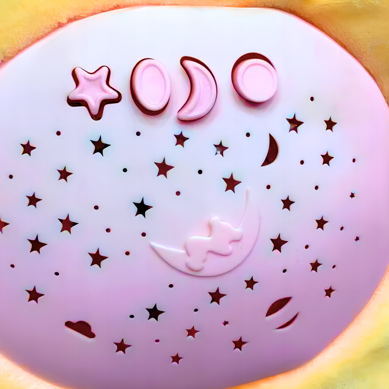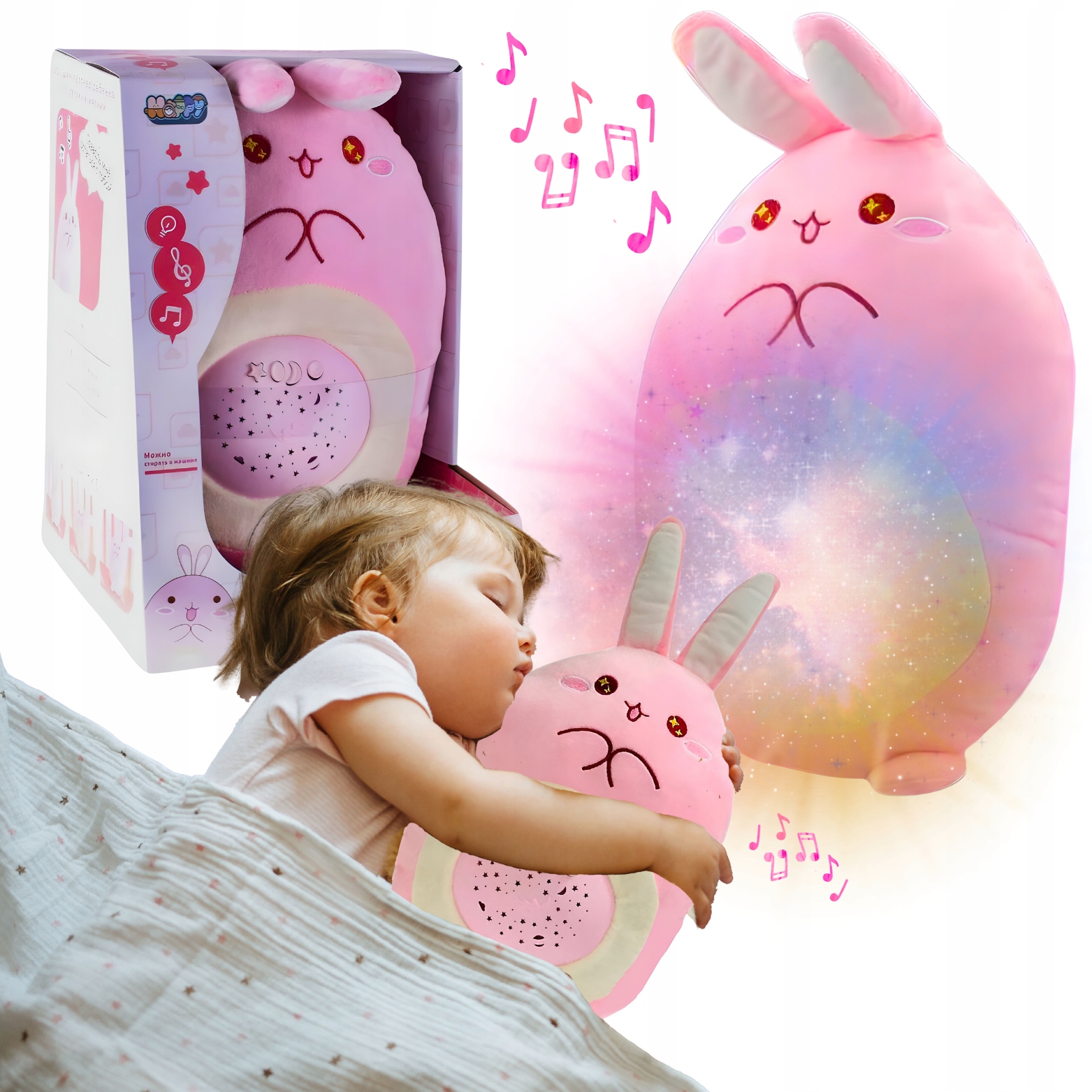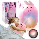 Króliczek posiada wbudowany kolorowy projektor gwiazd oraz funkcję pozytywki.