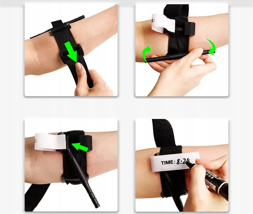 ✅ Samopomoc: Możliwość założenia jedną ręką na każdej kończynie, co umożliwia rannej osobie samodzielne zatamowanie krwawienia.