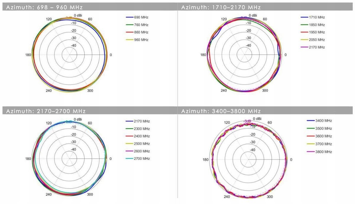 Wspiera pasma 698–960 MHz, 1700–2700 MHz oraz 3400–3800 MHz, oferując wzmocnienie do 3 dBi i wielokierunkową charakterystykę pracy.