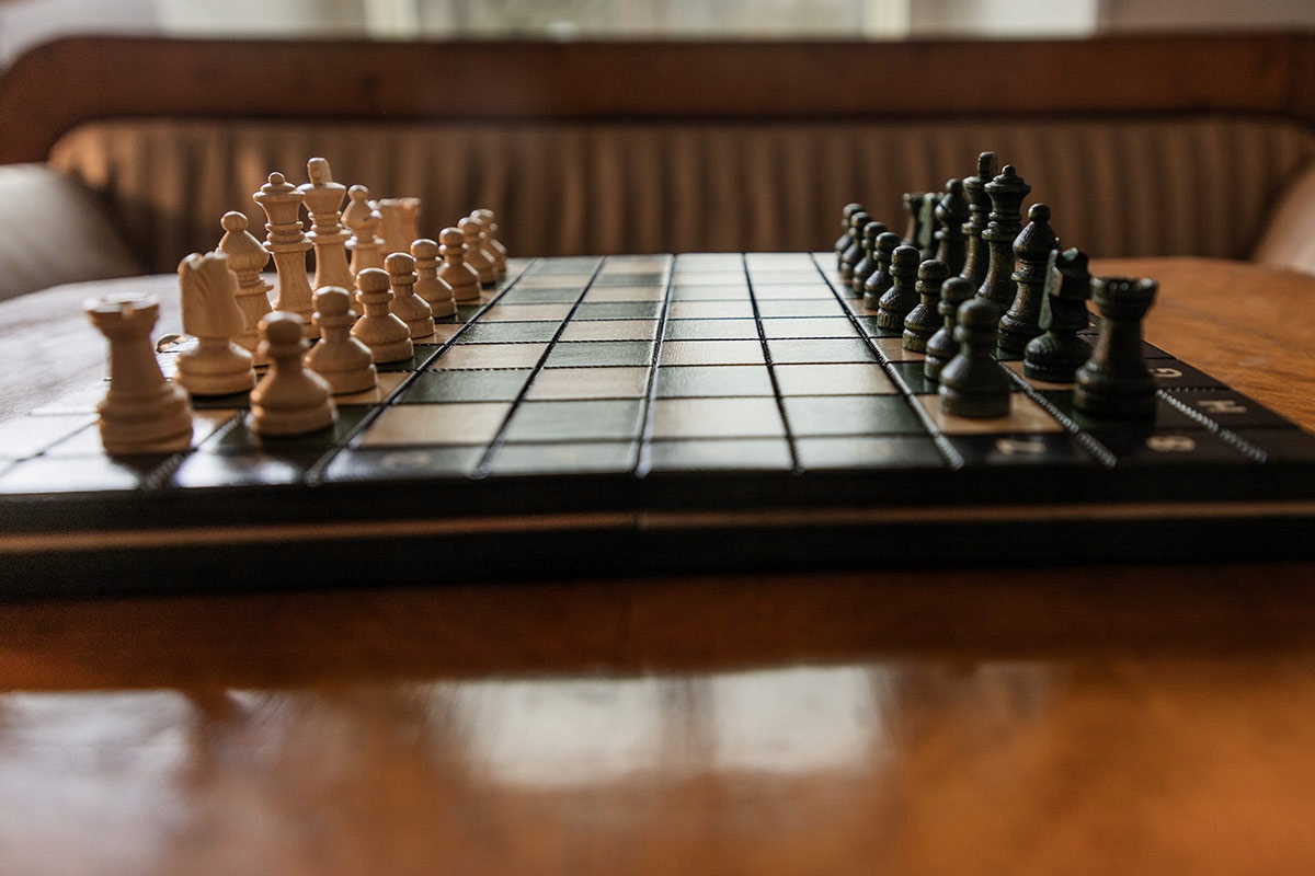 Внутри шахматной кассеты находится инкрустация, покрытая флоком, благодаря которому каждая фигура и пешка имеют свое место, что защищает их от механических повреждений. Чтобы защитить стол от царапин петли закрыты тканью.