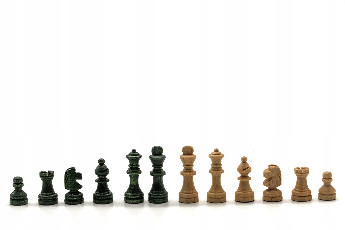 Шахматные фигуры были выкатаны из дерева с ручным завершением деталей (например, из дерева). грива у перемычек), высота короля около 50 мм.