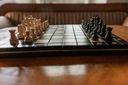 Игра в шахматы на ходу с помощью этой доски возможна благодаря размещению в кассете листового металла стали и фигур неодимовых магнитов.