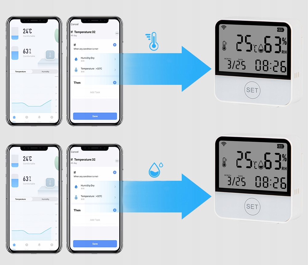 ✅ Inteligentne połączenie: Dzięki tej funkcji możesz dostosować temperaturę i wilgotność w pomieszczeniu. Gdy temperatura w pomieszczeniu osiągnie wyznaczoną przez użytkownika dostaniesz informację.