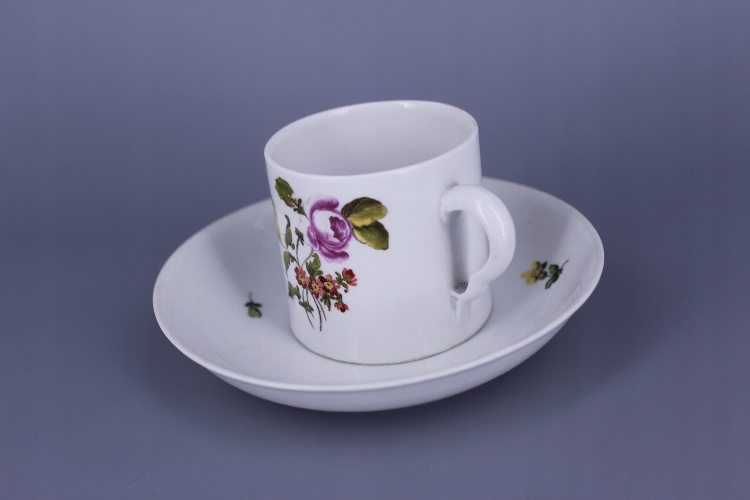 Stan: filiżanka posiada minimalne pęknięcie oraz 2 mikro odpryski od spodu.