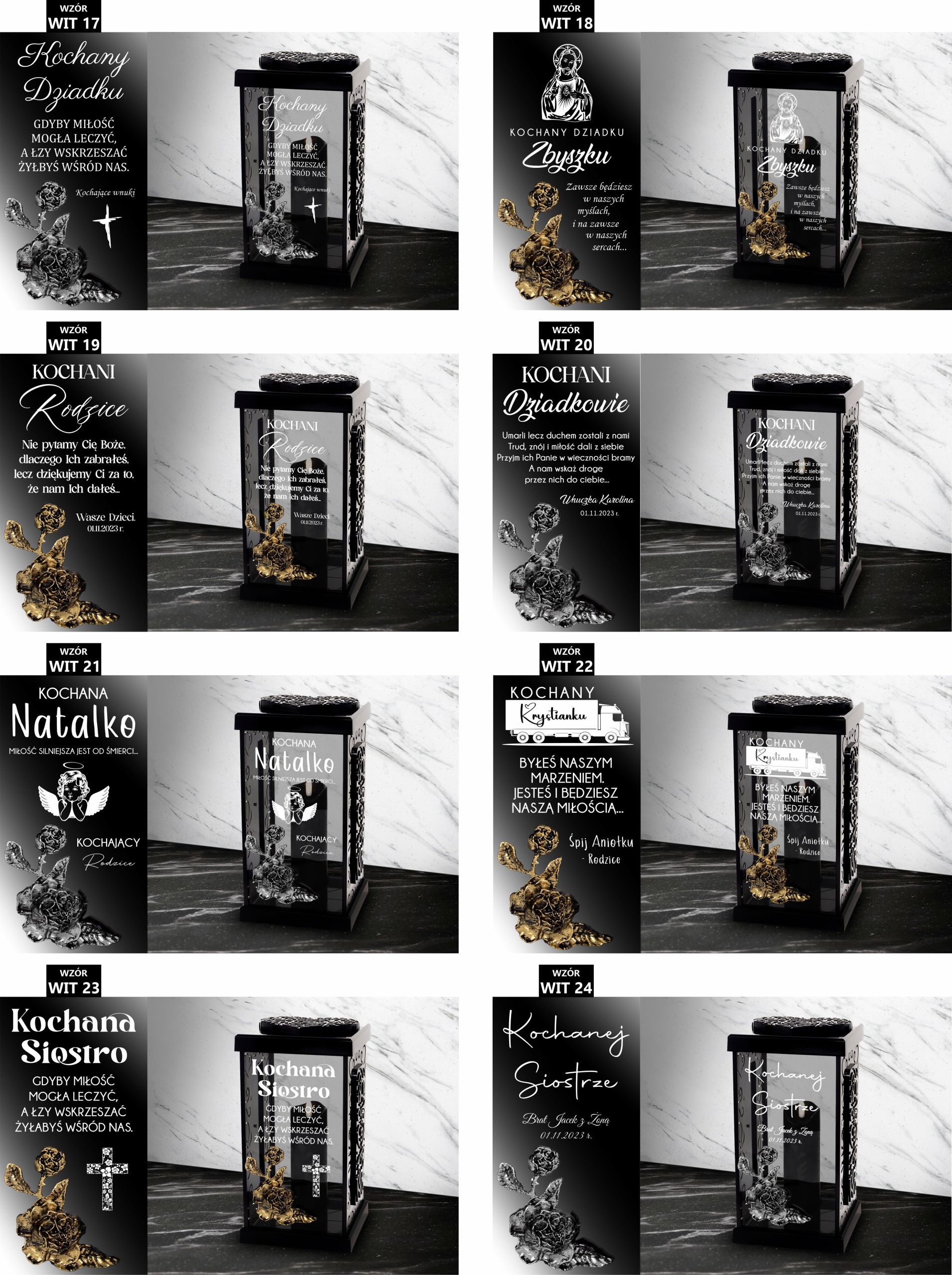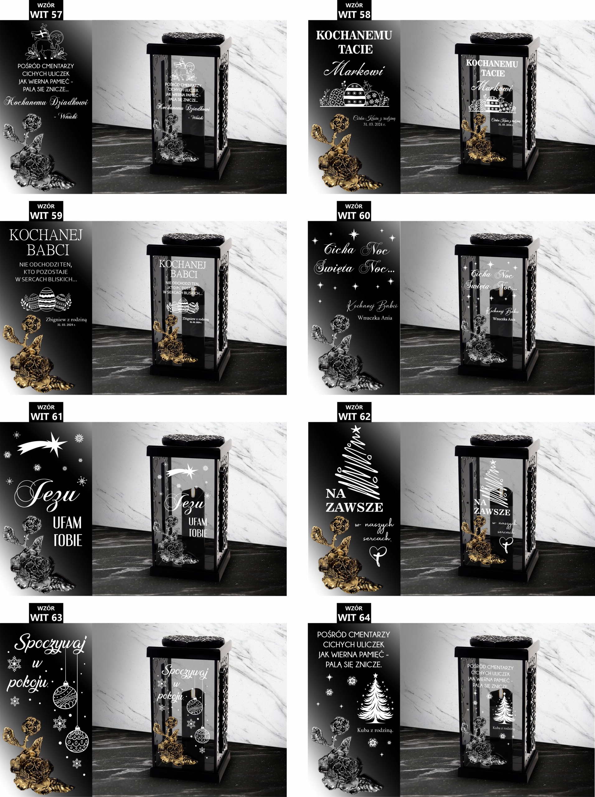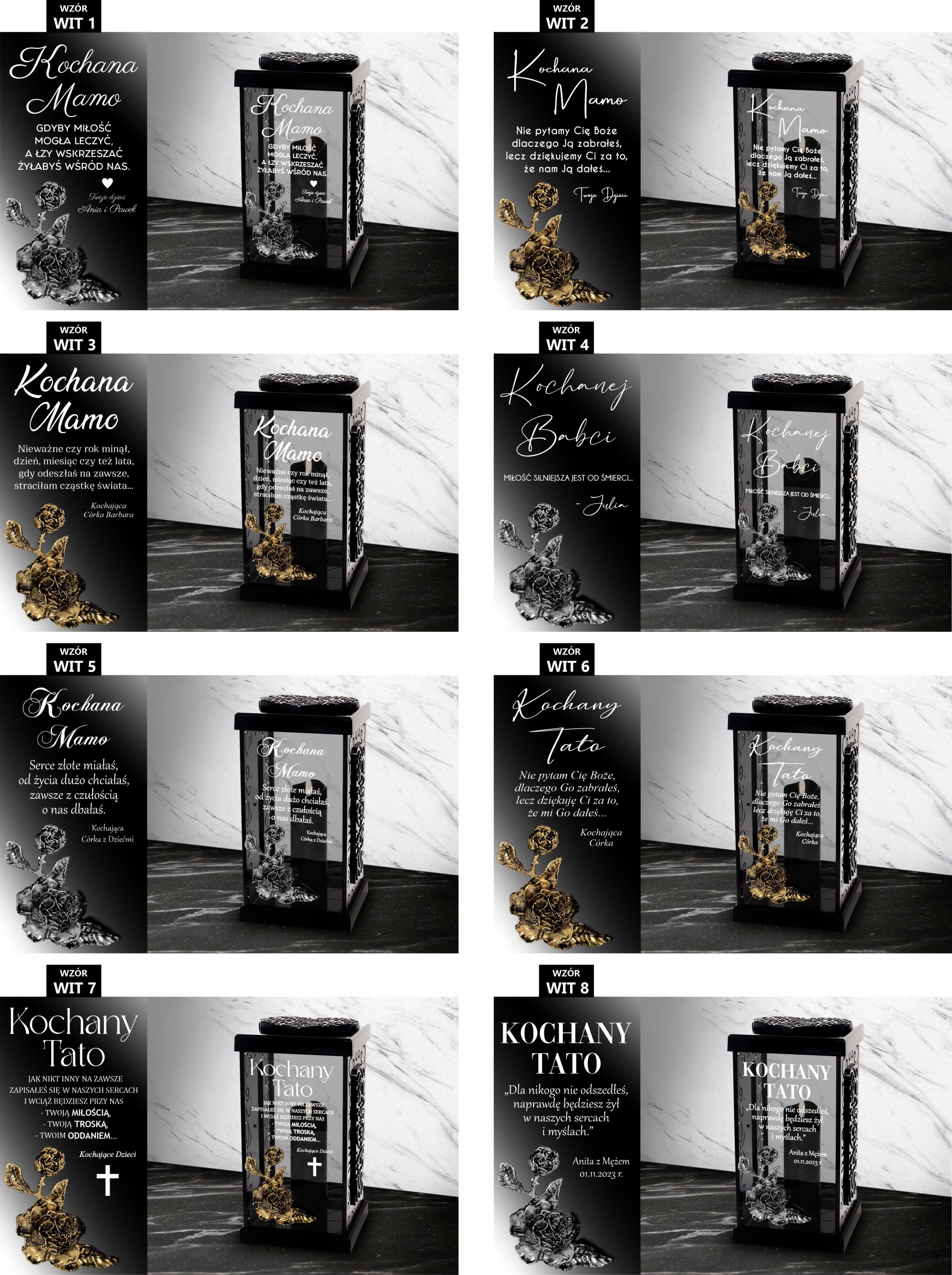 1. Po zakupie znicza w informacji od kupującego lub wiadomości prywatnej prosimy o napisanie nam numeru wybranego wzoru dostępnych poniżej ( np. WIT 1), koloru zdobienia róży ( złoty lub srebrny ) oraz danych do personalizacji (np. od kogo/data).