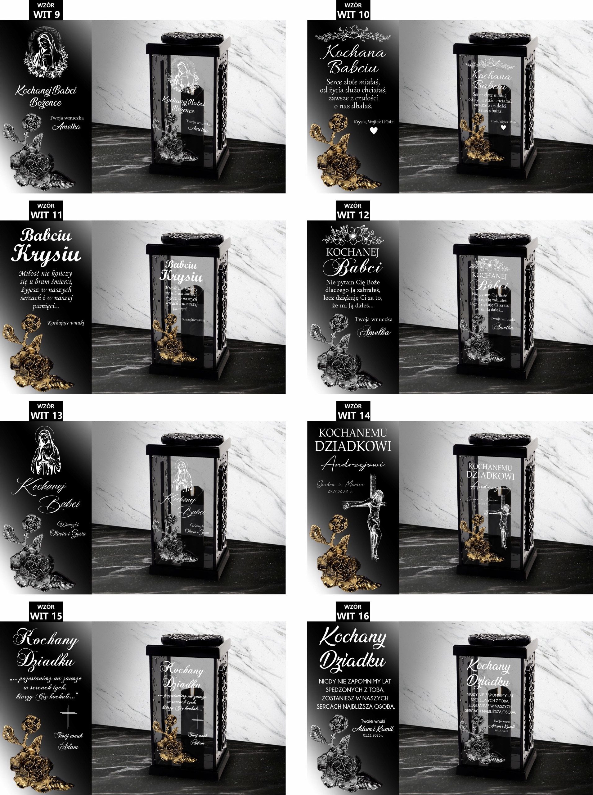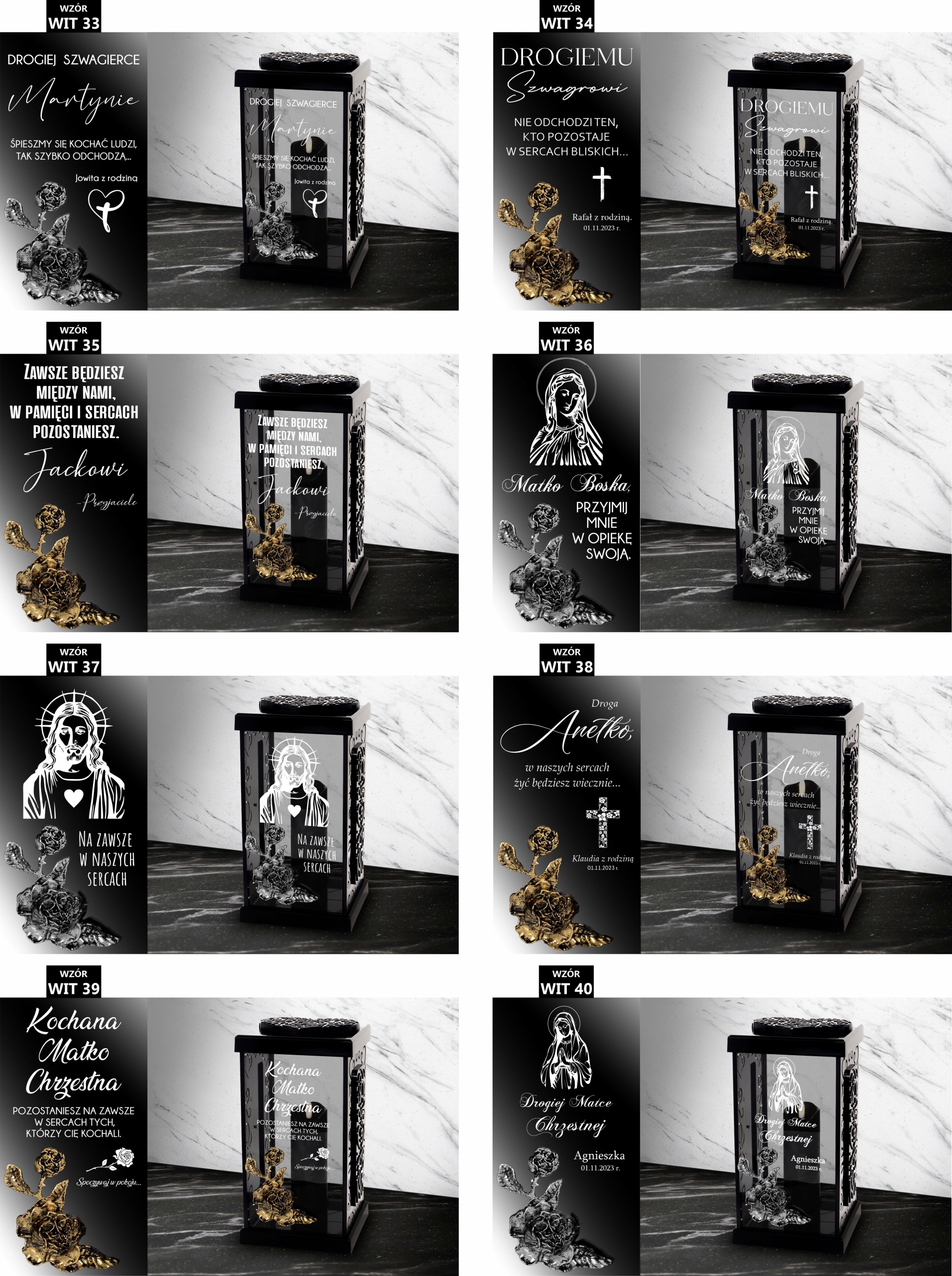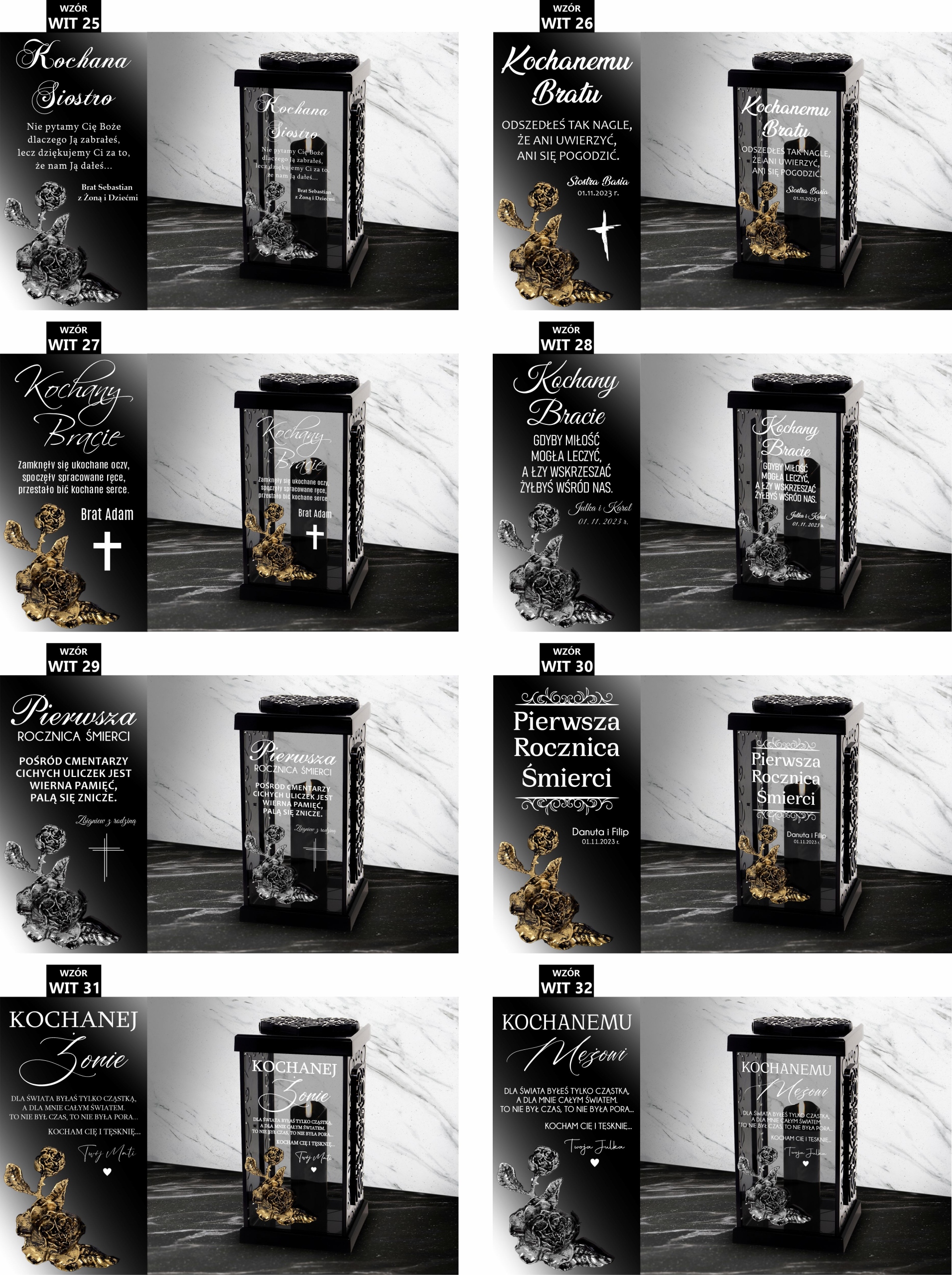 1. Po zakupie znicza w informacji od kupującego lub wiadomości prywatnej prosimy o napisanie nam numeru wybranego wzoru dostępnych poniżej ( np. WIT 1), koloru zdobienia róży ( złoty lub srebrny ) oraz danych do personalizacji (np. od kogo/data).