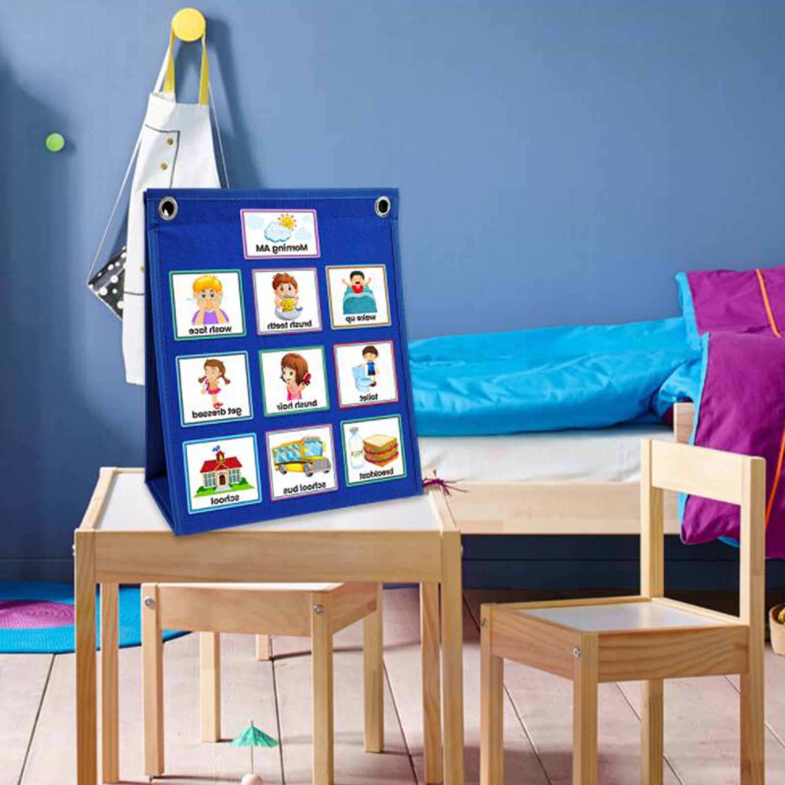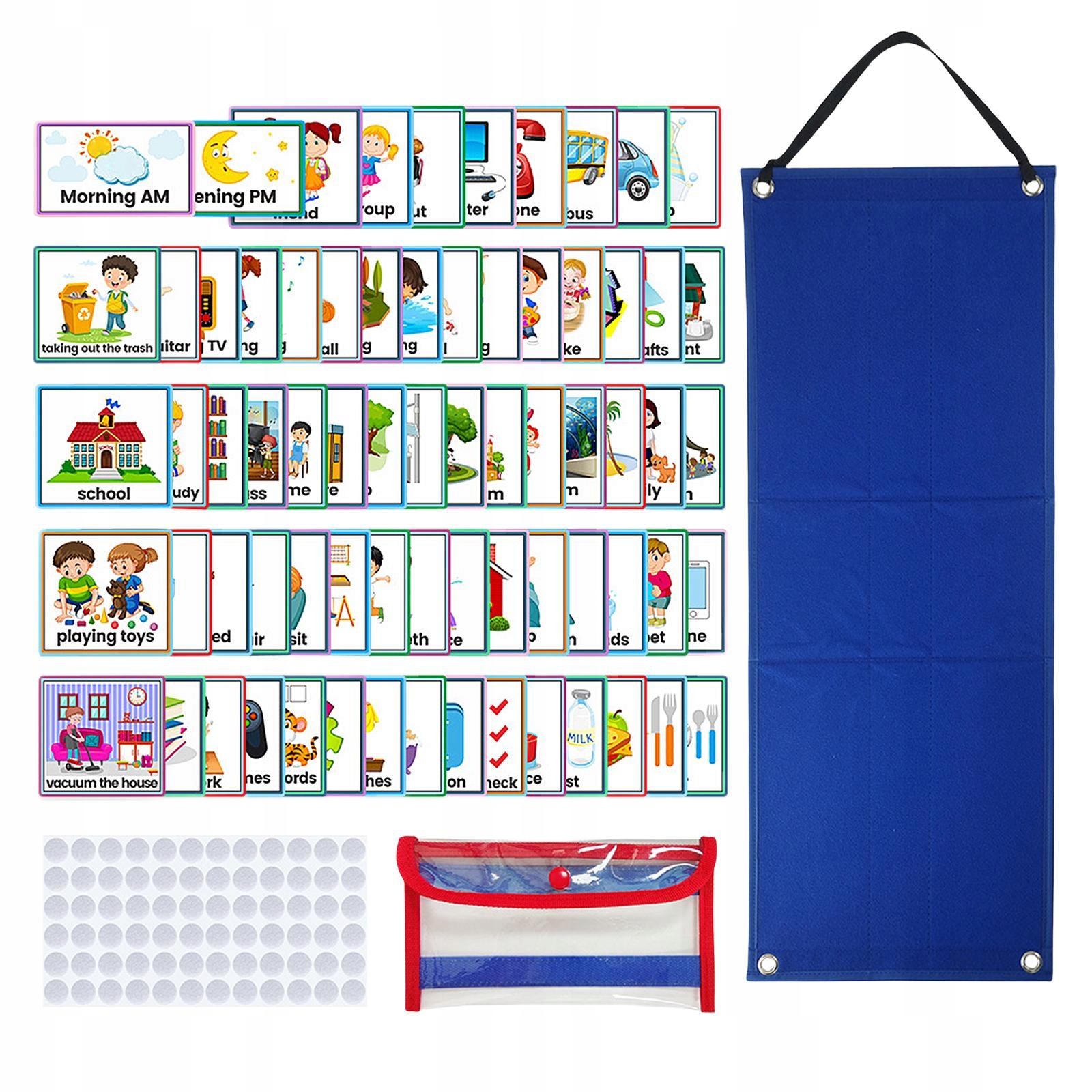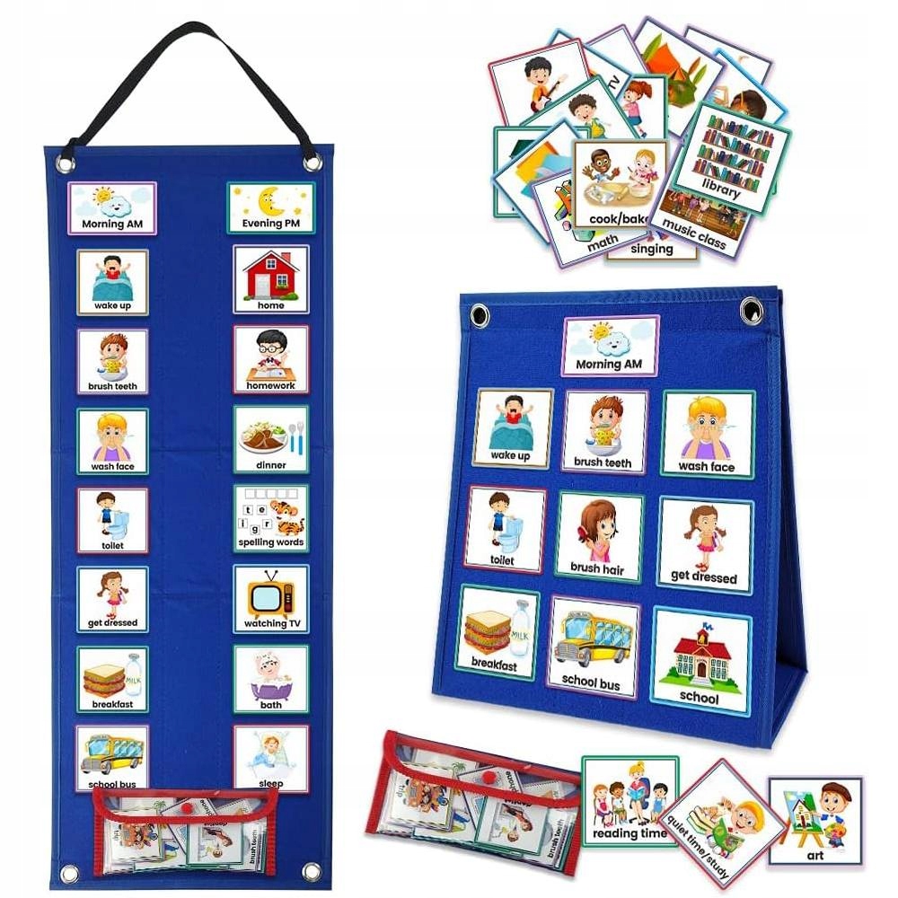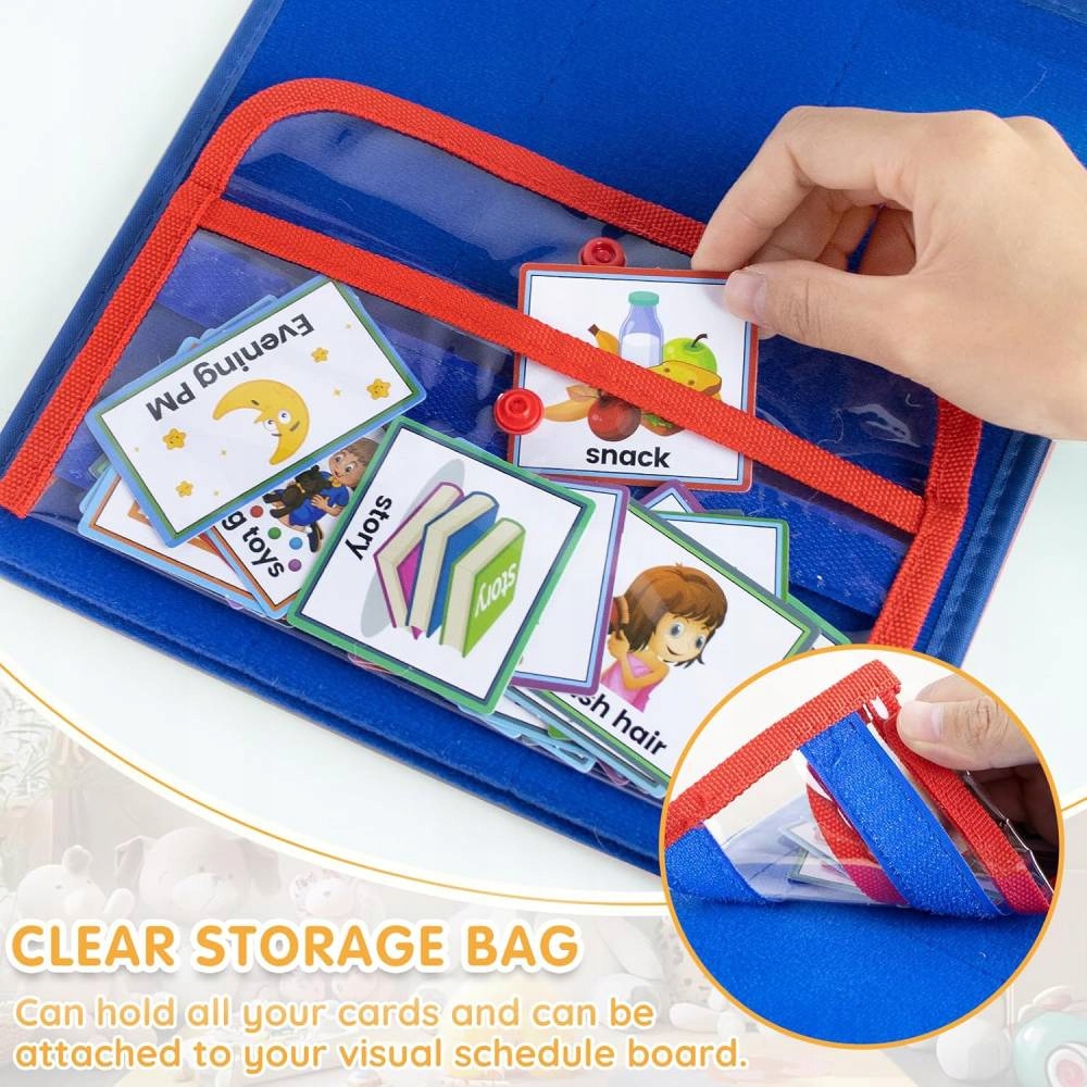 Bogate kombinacje: Ten codzienny harmonogram wizualny składa się z 70 różnych kart obejmujących każdy aspekt życia. Dzieci mogą wkładać gotowe zadania do torby, a często poprzez wzrok zbierają informacje o swoich codziennych zadaniach.