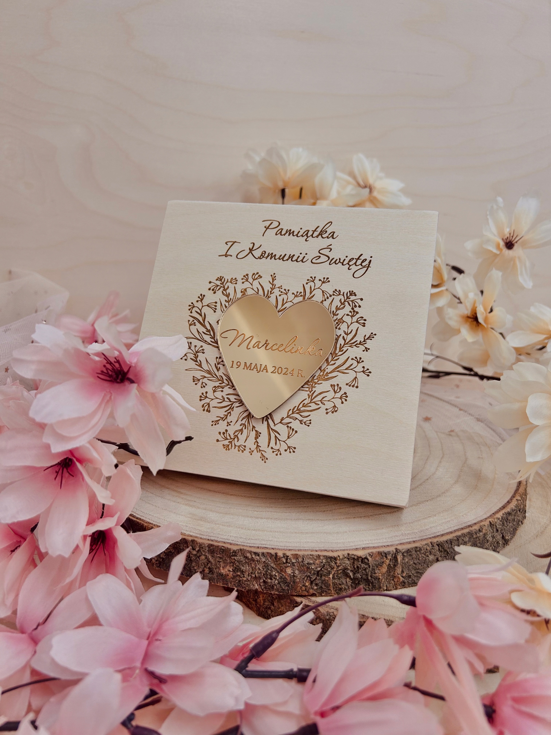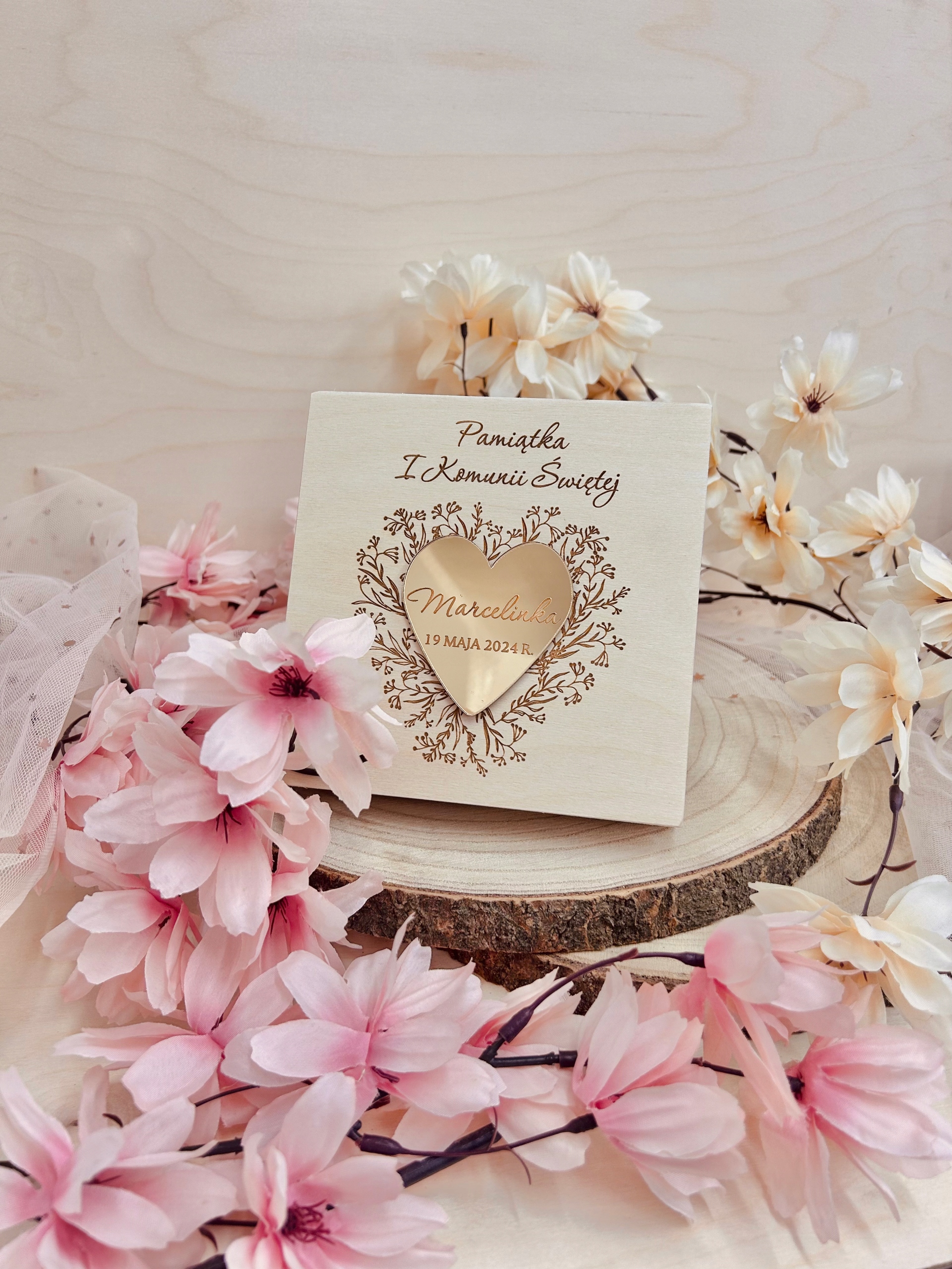Pamiątka Komunii Świętej w formie pudełka to unikalny pomysł na prezent. Produkt wykonany jest z drewna oraz złotego lustra akrylowego. Pamiątka przygotowywana jest na indywidualne zamówienie. Jest to wyjątkowy prezent oraz piękna pamiątka dla dziecka.
