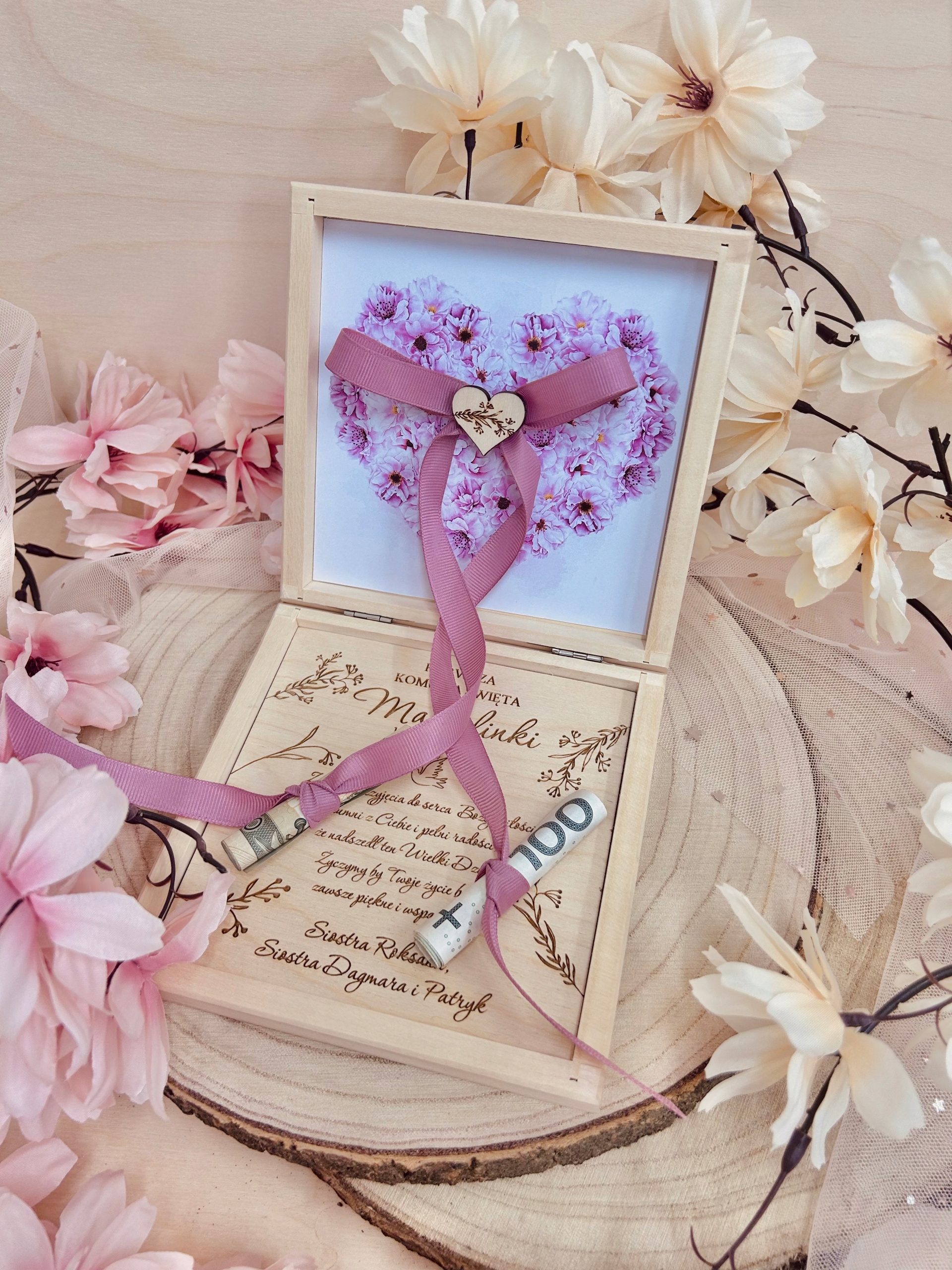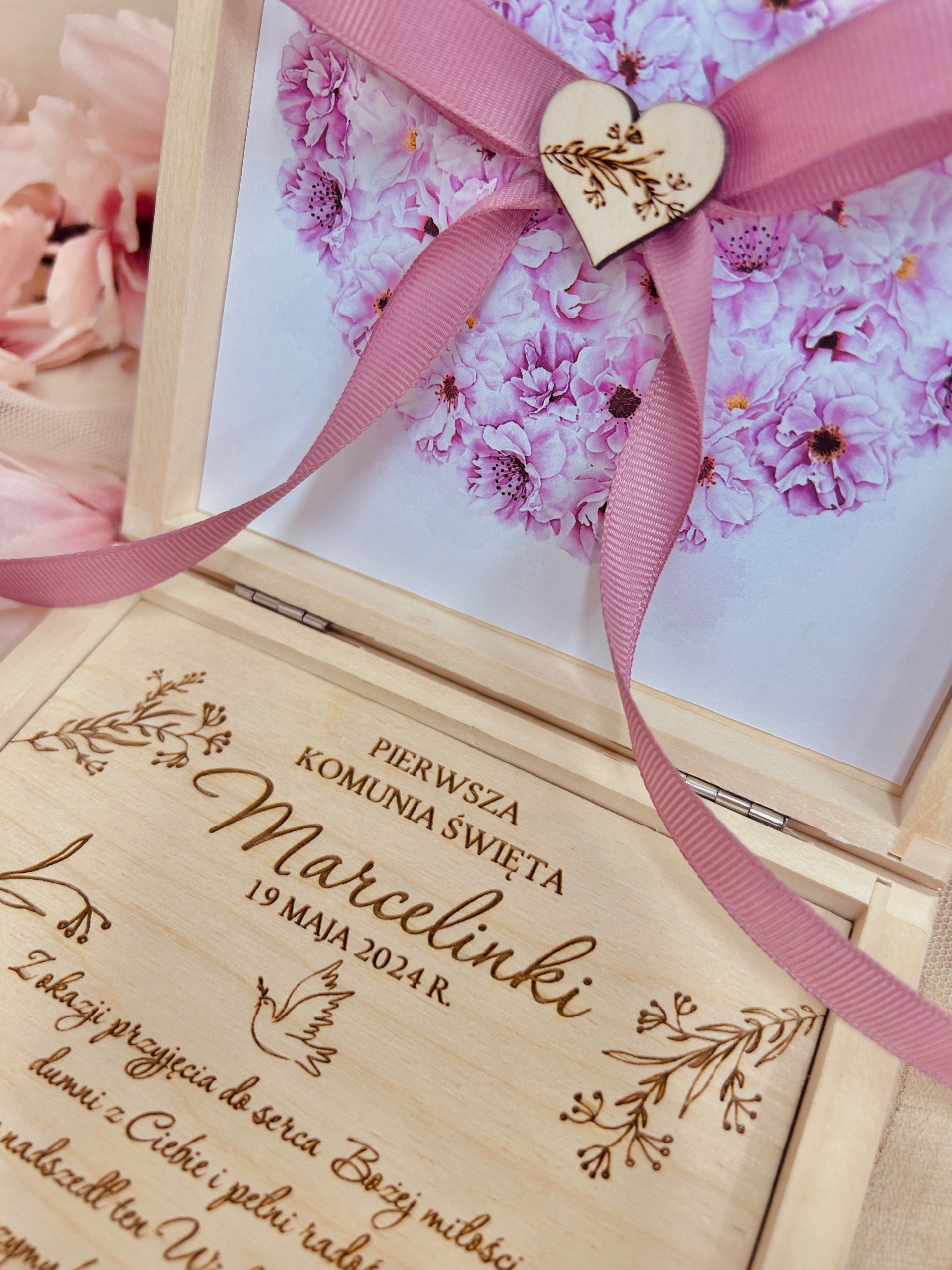 W pudełeczku znajdują się życzenia i podpis, które podlegają personalizacji. Do pudełeczka zmieszczą się banknoty i inne drobne upominki np. łańcuszek. Na zewnątrz pudełka grawerowane jest imię dziecka oraz data uroczystości.