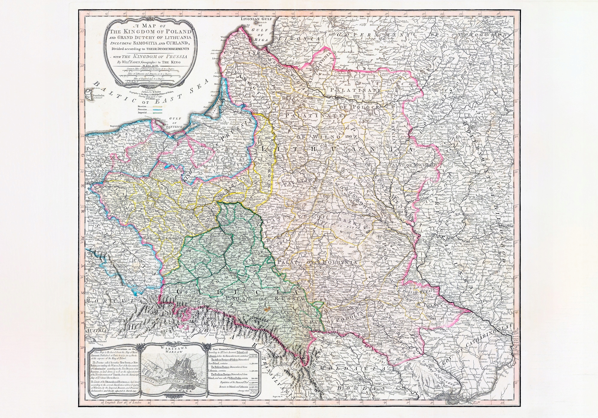 Reprodukcja mapy z roku 1799 ukazująca granice trzech rozbiorów Polski, autorstwa Willa Fadena.