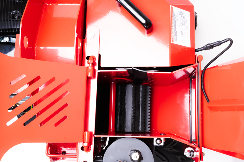 Rozdrabniacz spalinowy z elektrycznym rozrusznikiem i hydraulicznym podajnikiem gałęzi.