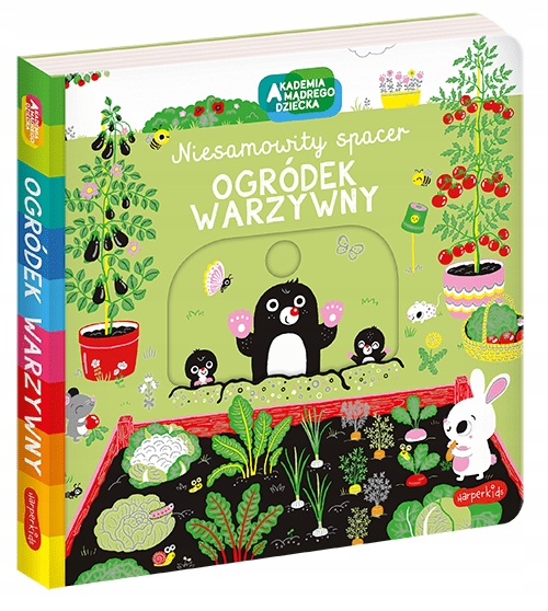 Ogródek Warzywny z serii Niesamowity spacer to książeczka dla najmłodszych z ruchomymi elementami oraz srebrnymi tłoczeniami. Kontrastowa kolorystyka oraz uproszczona forma ułatwią zapamiętywanie poszczególnych słówek, poprzez skojarzenie ich z otaczającą dzieci rzeczywistością. Grube, solidne strony zapewnią wytrzymałość oraz długie użytkowanie, wspomagając rozwój manualny małych rączek. W książeczce Ogródek warzywny nasz czytelnik poznaje warzywa, które można uprawiać na grządkach oraz zwierzątka, które lubią chrupać zielone przysmaki. Mały króliczek podjada liście kapusty, a krecik zajada się marchewkami i rzodkiewkami. Obok warzyw rośnie także wiele kolorowych kwiatów, które zapylają pszczółki oraz na których płatkach przysiadają kolorowe motyle. Niezaprzeczalnym atutem serii książeczek „Akademia mądrego dziecka. Niesamowity spacer” są ruchome elementy, odkrywające przed maluchami odpowiedzi na umieszczone w książce pytania oraz zmieniające wygląd poszczególnych ilustracji. Taka forma łączy zabawę z nauką i intryguje dzieciaki, zachęcając je do samodzielnego sięgania po lekturę. Książeczka edukacyjna świetnie sprawdzi się podczas poznawania prostych słów, nazw przedmiotów i ich przeznaczenia.