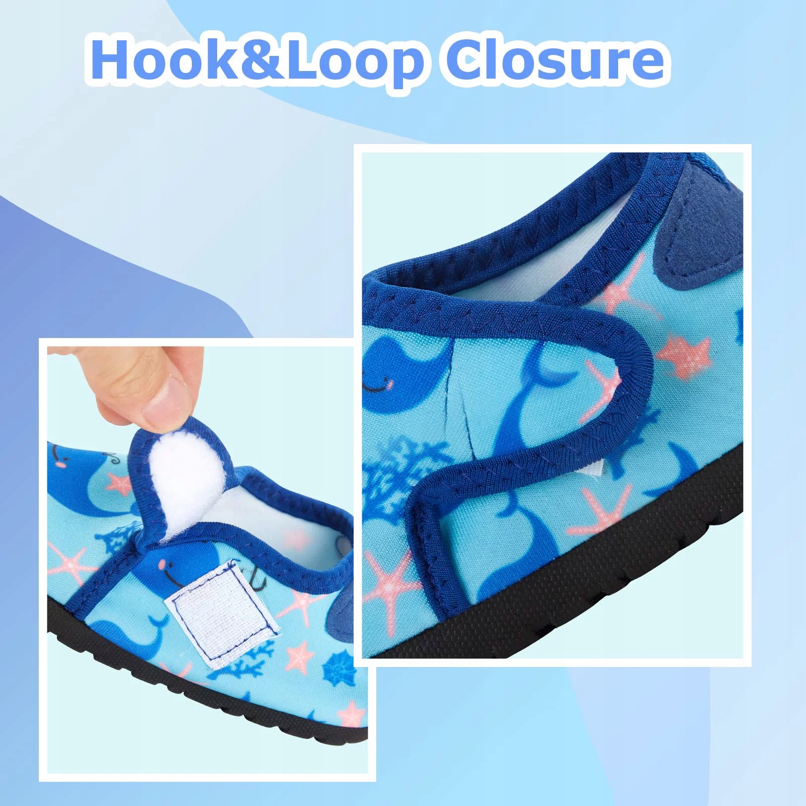 ŁATWE ZAKŁADANIE I ZDEJMOWANIE: Zapięcie na rzep i konstrukcja z zakrytymi palcami sprawiają, że buty do wody dla małych dzieci są łatwe do zakładania i zdejmowania, a lekki, ściśliwy materiał pozwala na łatwe składanie i przenoszenie podczas podróży.
