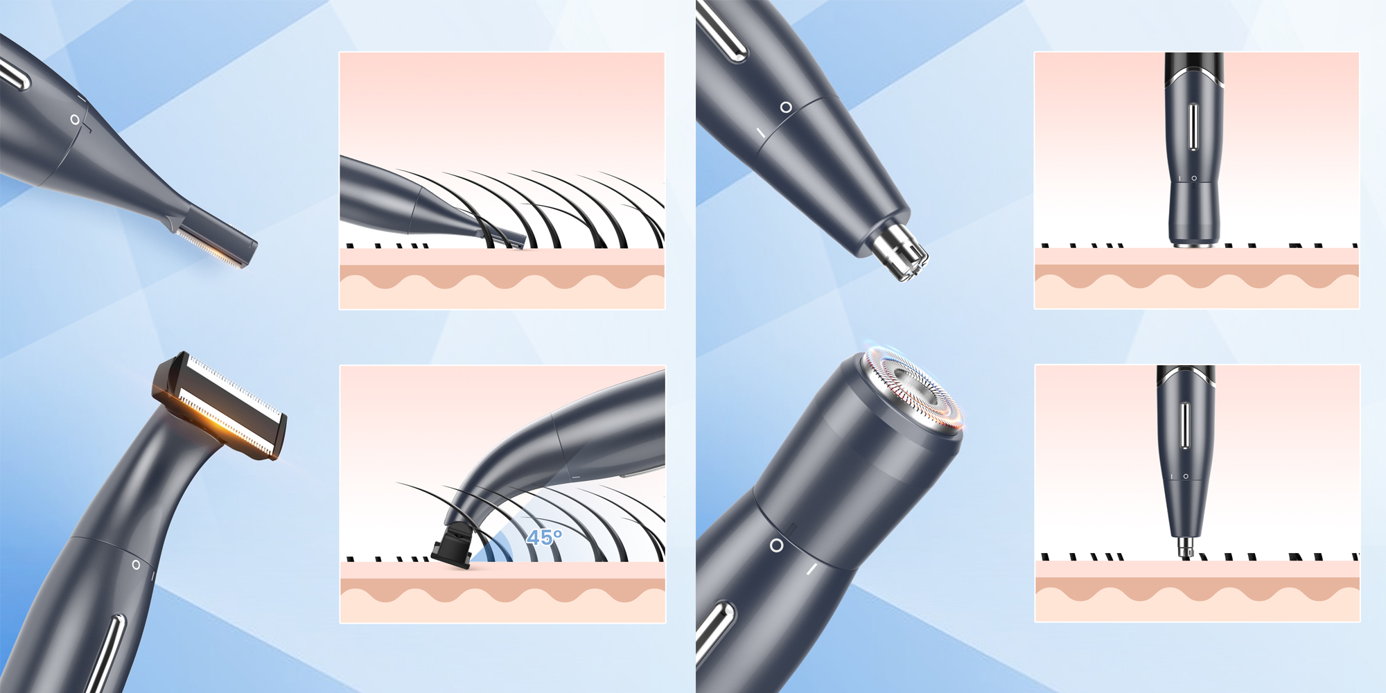 ✨ Utrzymuje kąt 30-45 stopni względem skóry w celu wstępnego przycinania grubych, długich włosów. Środkowa folia umożliwia dokładne golenie, np. pach. Ponieważ skóra jest nierówna/zakrzywiona, należy ją mocno naciągnąć.