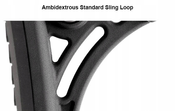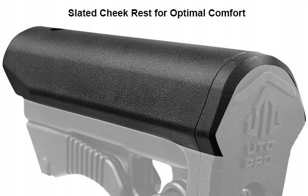 Kolba posiada sześciopozycyjną blokadę oraz dwustronny port Quick Detach i ucho na zawieszenie o szerokości 36 mm. Przystosowana jest do bak policzkowych firmy UTG, dzięki swojej konstrukcji sprawdzi się w setupie długim i krótkim.