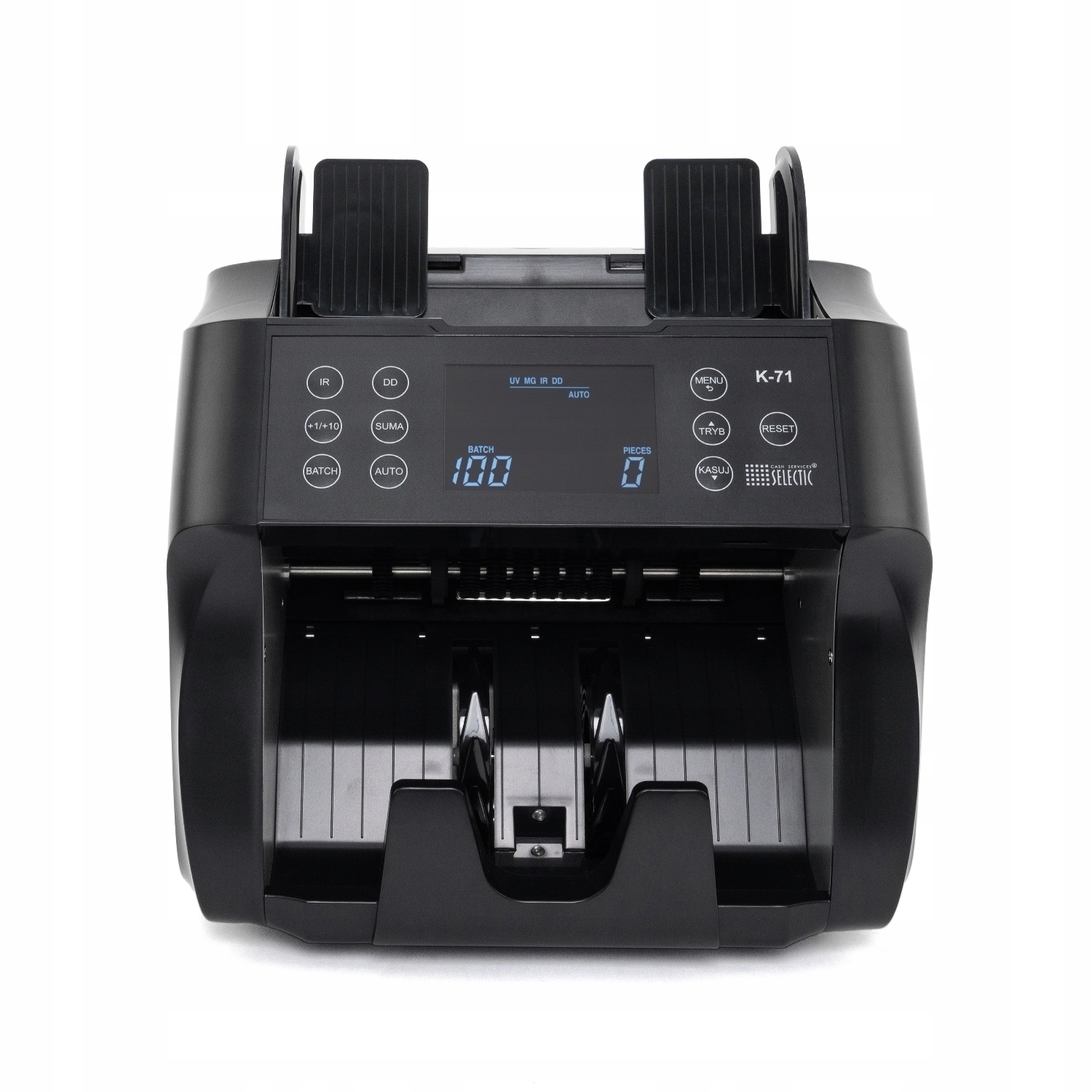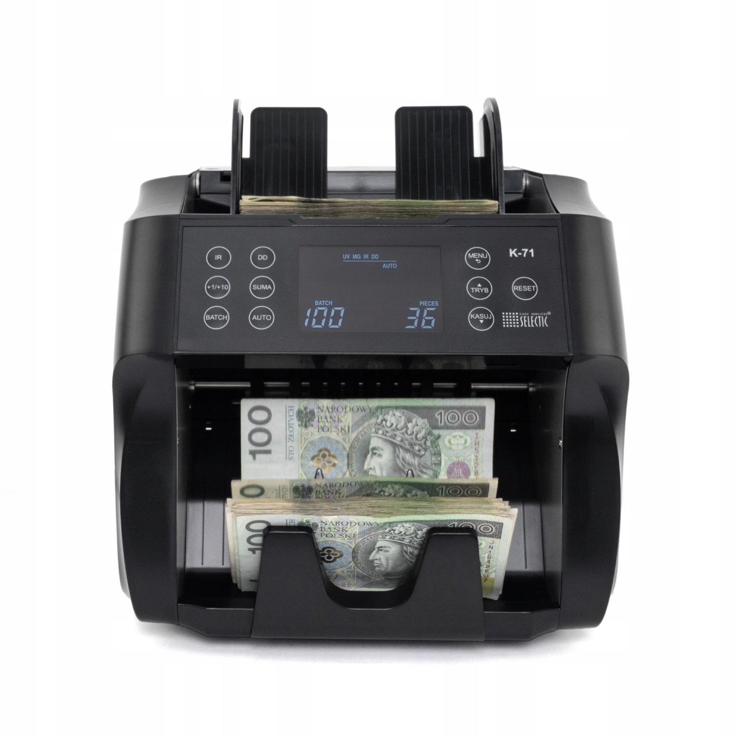 Liczarka do banknotów SELECTIC K-71 to proste i przyjazne urządzenie z panelem LCD oraz klawiaturą w języku polskim. Zastosowano sprawdzone rozwiązania konstrukcyjne zapewniające płynną i bezawaryjną, wieloletnią pracę. Bada banknoty polskie a także EURO i inne waluty pod kątem prawdziwości, wykorzystując technologię fluorescencji ultrafioletowej oraz analizy pola magnetycznego. Wykrywa podwójne banknoty i weryfikuje rozmiar. Liczarka prawidłowo wykrywa (funkcja DD) mniejszy rozmiar banknotu w pliku większych nominałów.