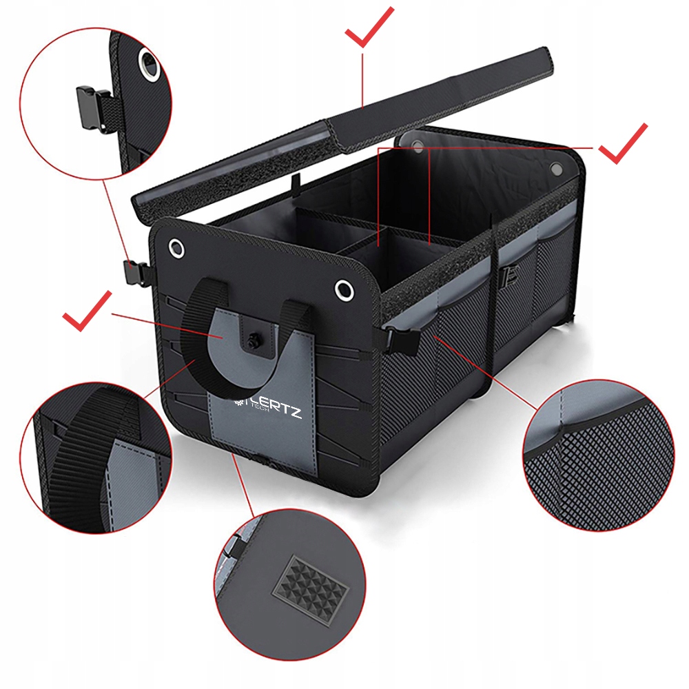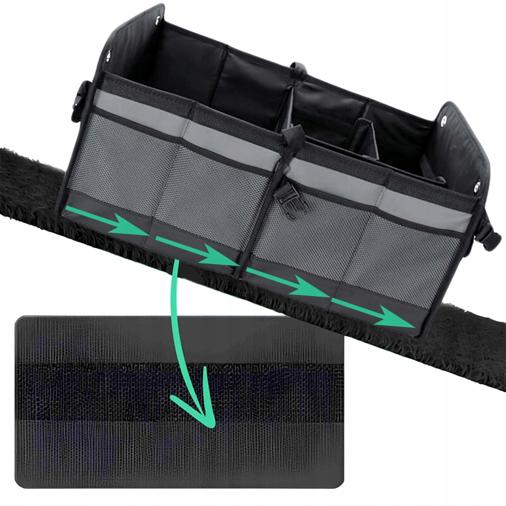 Na spodzie organizera umieszczone są rzepy mocujące do materiału bagażnika. Dzięki temu organizer nie będzie przesuwać się po bagazniku nawet podczas dynamicznej jazdy !