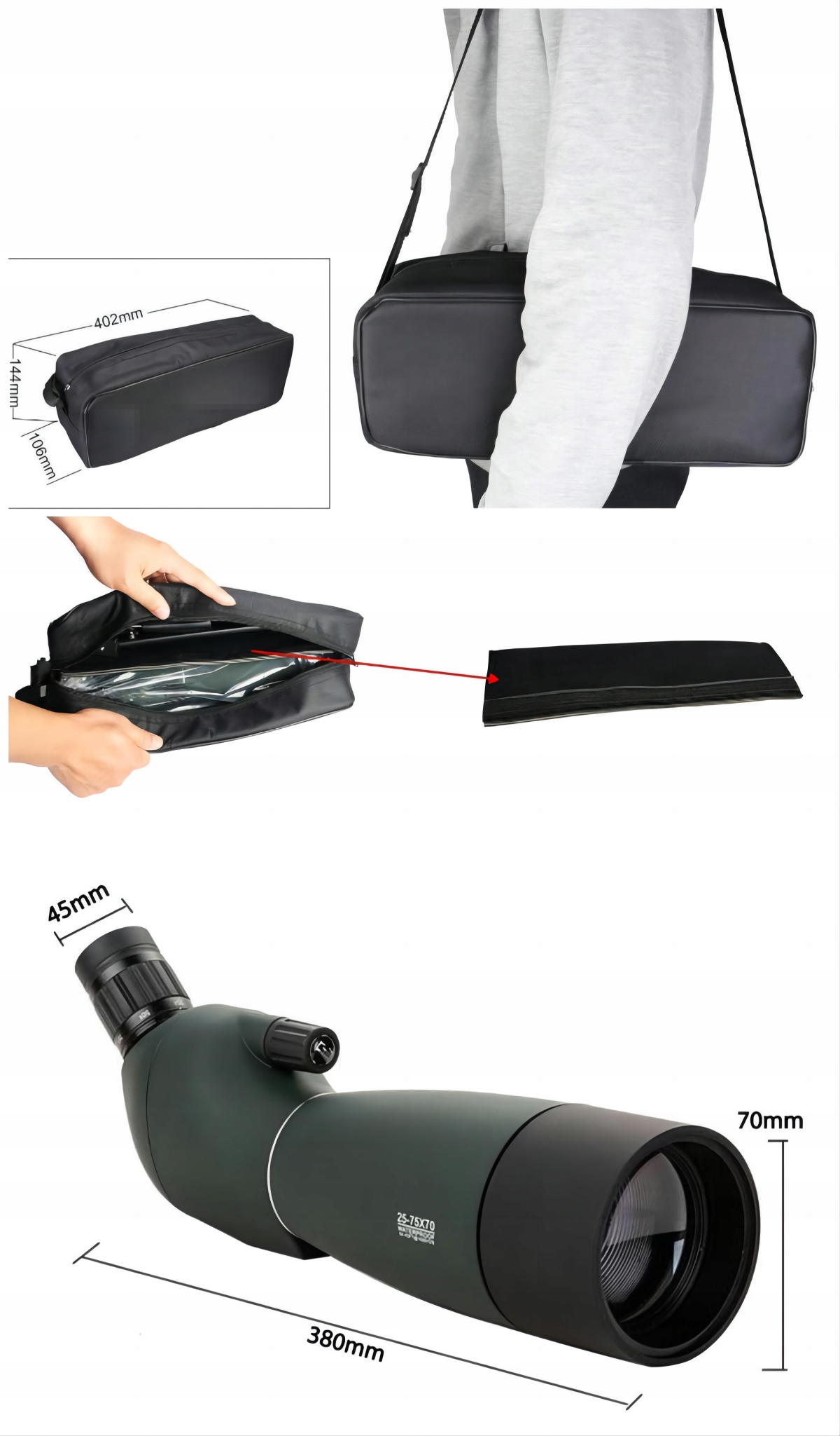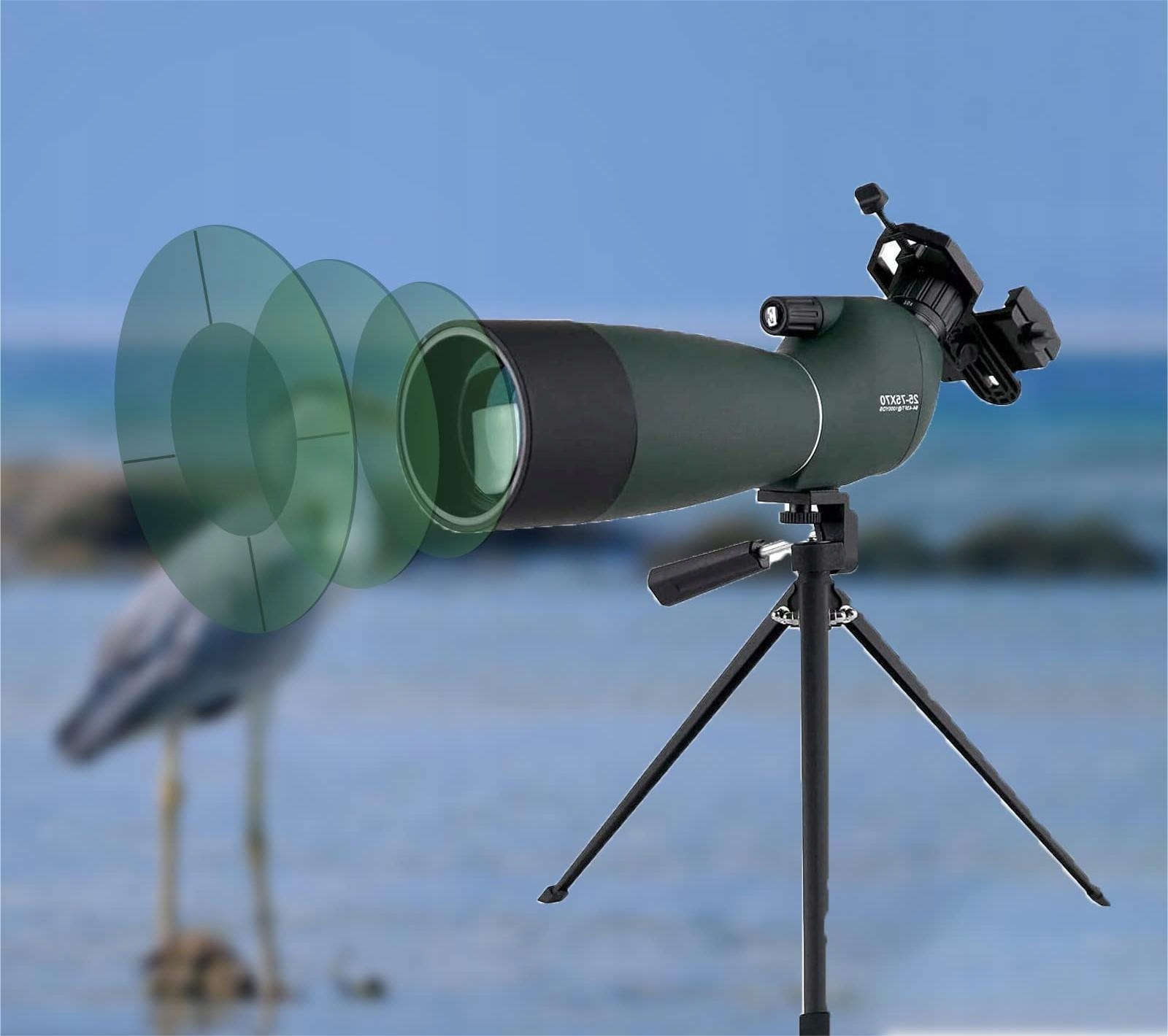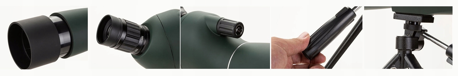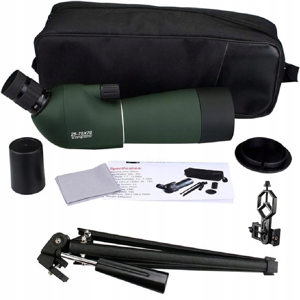 1. chowana osłona ochronna; 2. Składana muszla oczna; 3. Płynne porcja regulacji; 4. Łatwa w zasilaniu regulowanym; 5. Statyw z wysokości; 6. Zawiera klipy na telefony komórkowe do tworzenia zdjęć, współudziału.
