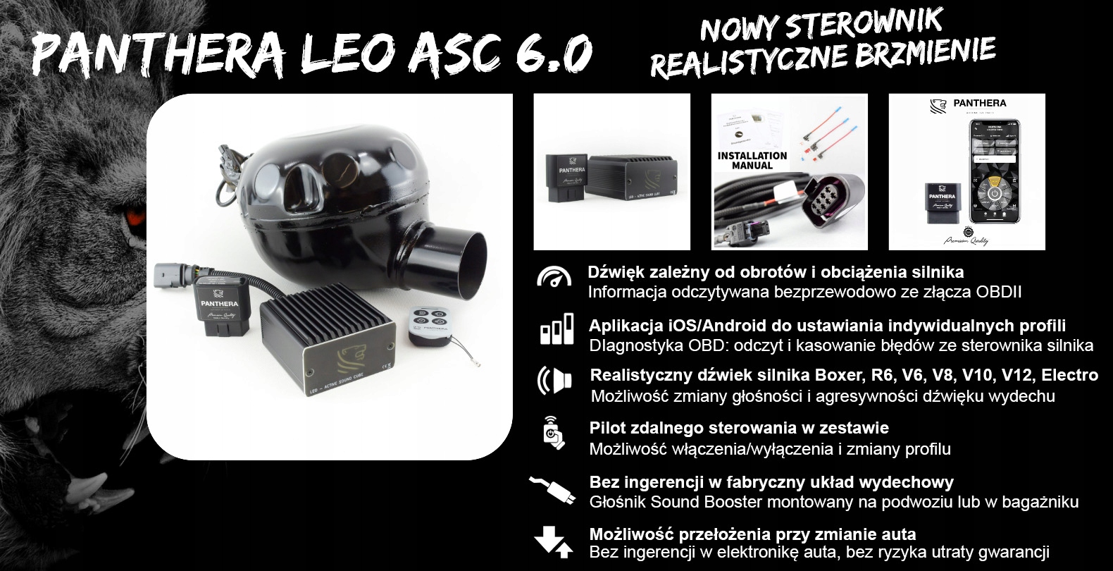 Активный выхлоп Panthera состоит из одного или двух звуковых генераторов Sound Booster, проводки и компоновки Active Sound Cube . ASC считывает все необходимые данные, такие как нагрузка, скорость и обороты двигателя. Благодаря этому получился спортивный и реалистичный звук звук выхлопа независимо от версии двигателя автомобиля.