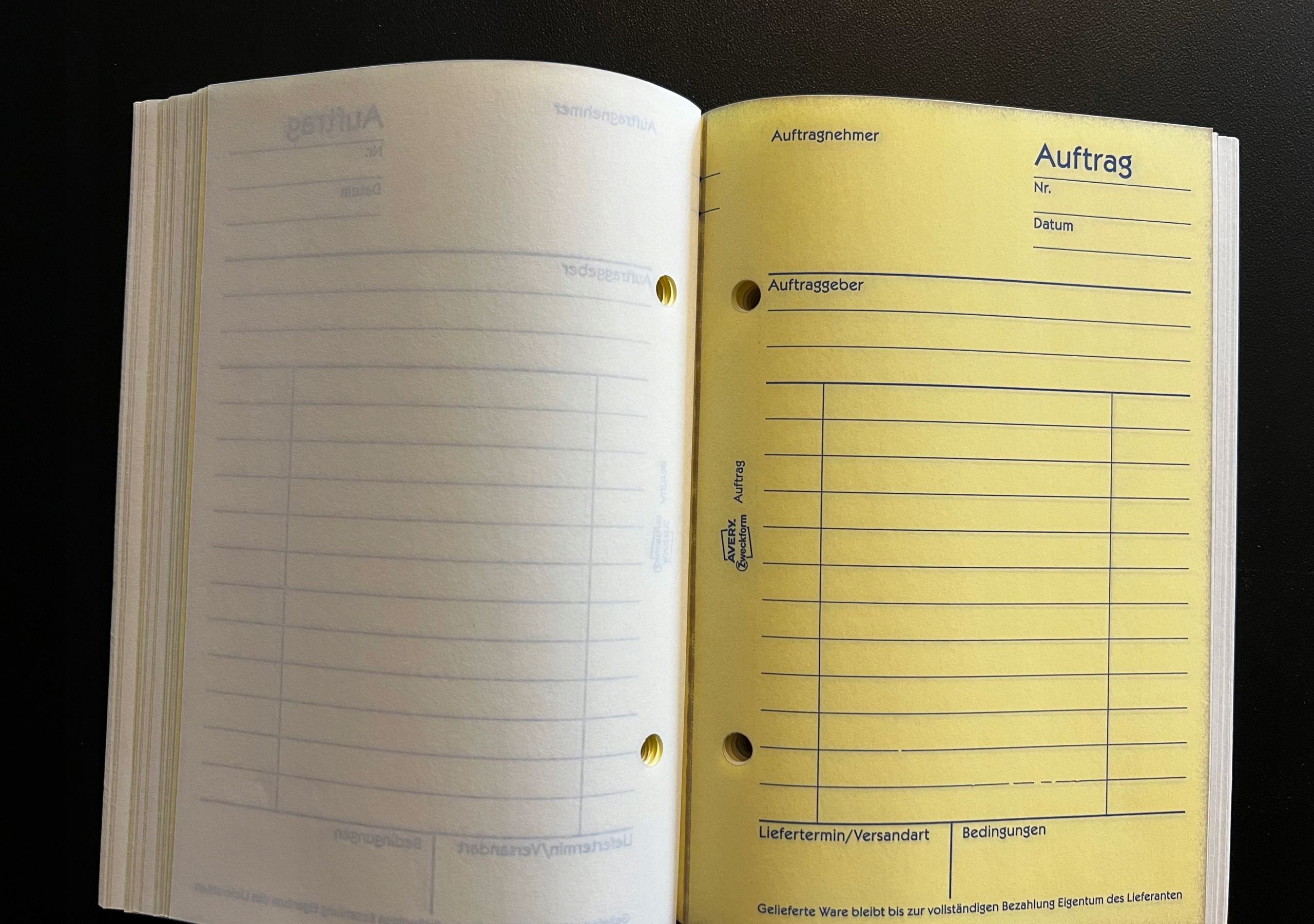 Samokopiująca książeczka z zamówieniami, każda z żółtymi kopiami – 1. i 2. Drukowany arkusz, z polem do podpisu dla zleceniodawcy