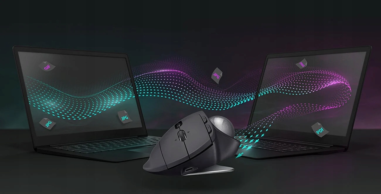 Obsługuj płynnie dwa komputery za pomocą trackballa MX ERGO z technologią Flow – po prostu przesuń kursor na brzeg ekranu. Trackball podąży płynnie za Tobą, nawet z komputera z systemem Windows® na macOS, pozwalając przesyłać tekst, obrazy i pliki pomiędzy nimi za pomocą Logi Options+. Wystarczy skopiować element na jednym komputerze, a wkleić na drugim.
