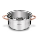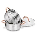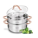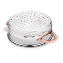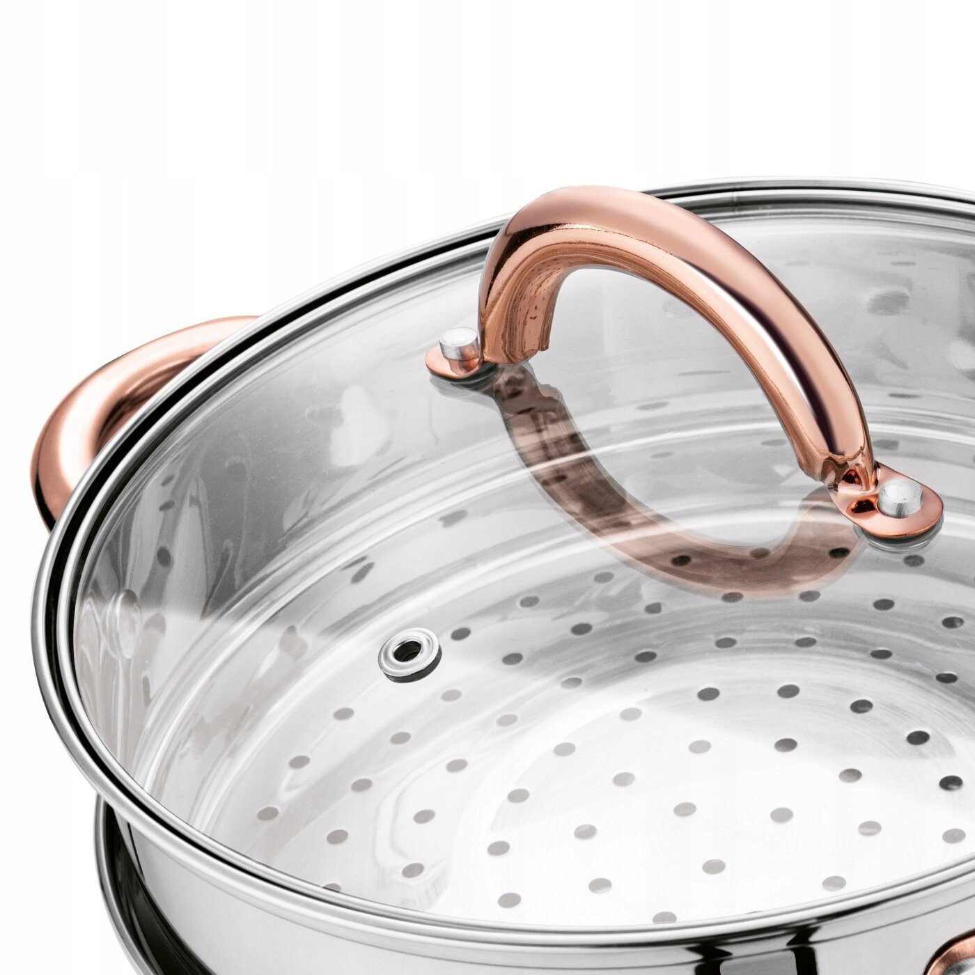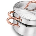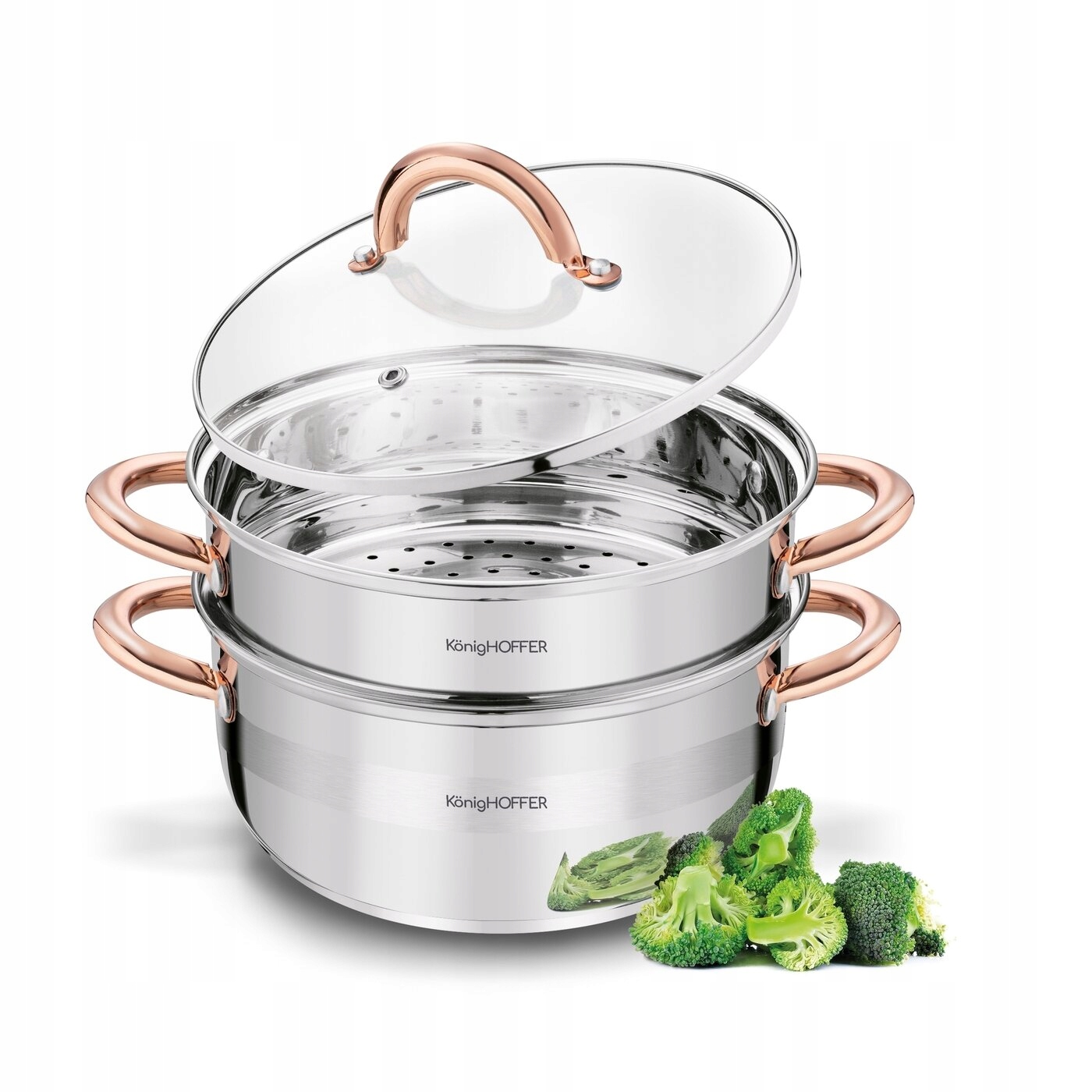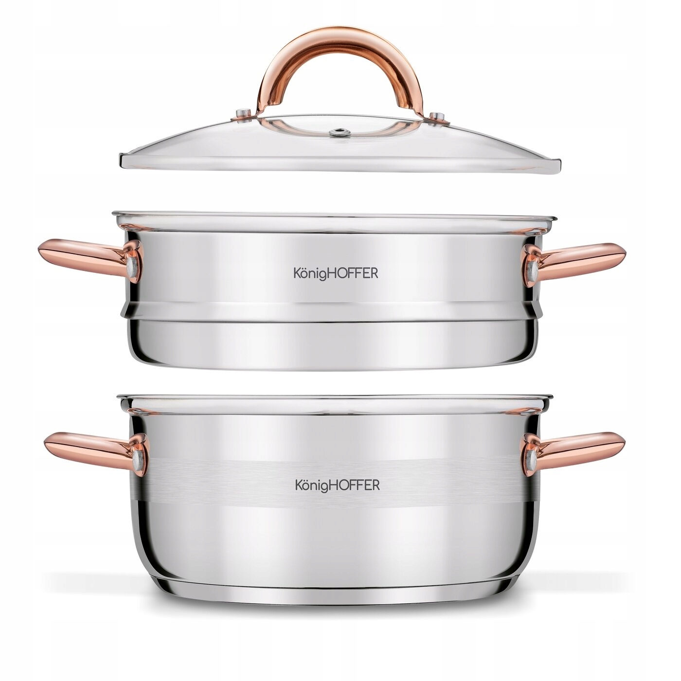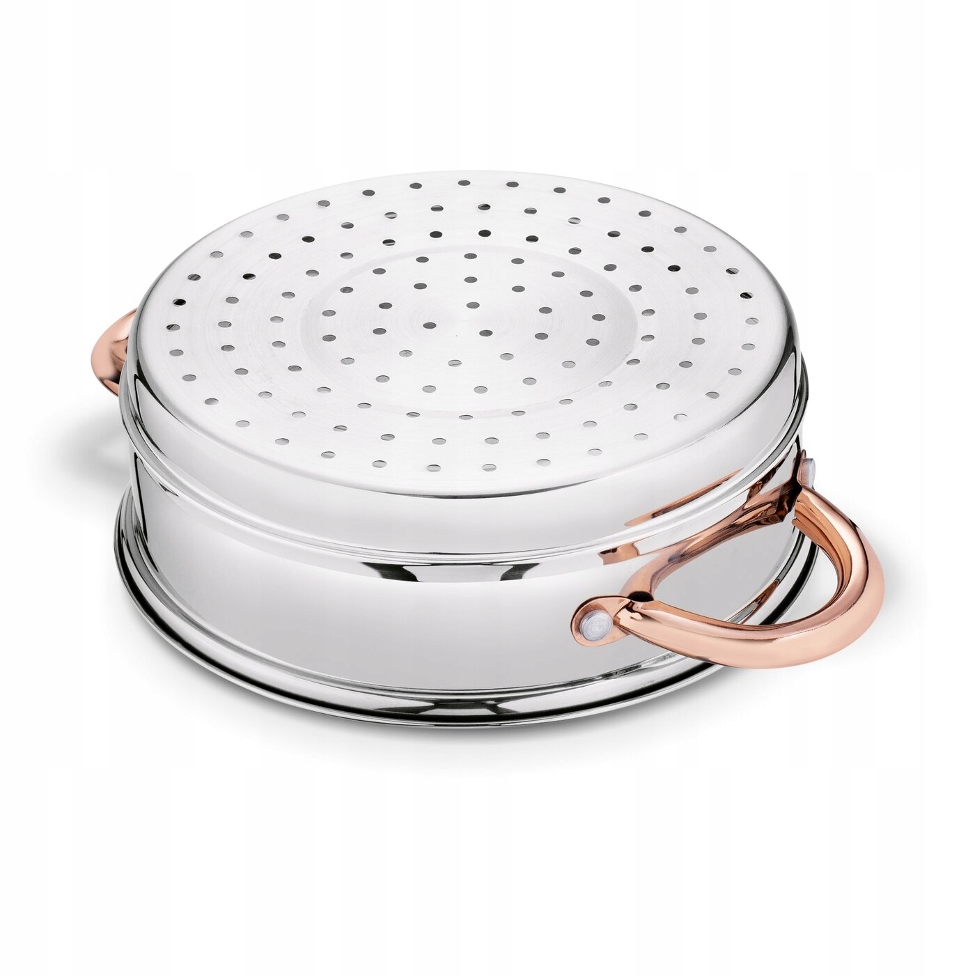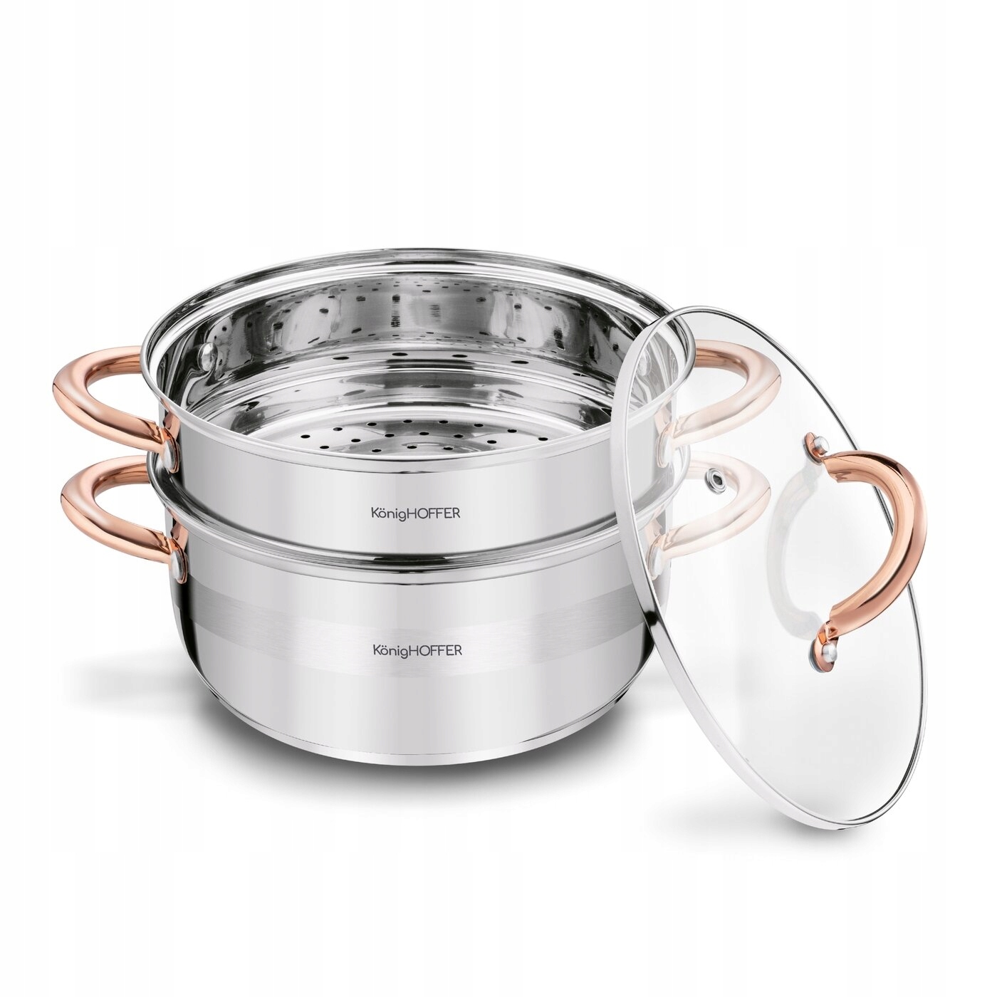 Garnek do gotowania na parze Konighoffer Faro Copper ma pojemność 2,9 l. Produkt wykonano z trwałej stali nierdzewnej i wyposażono w nitowane uchwyty. Składa się on z 3 elementów i jest prosty w pielęgnacji (tylko mycie ręczne). W takim garnku z wyjmowanym sitkiem przygotujesz dla bliskich lekkostrawne i zdrowe posiłki. Użyjesz go do różnych składników, w tym mięs, pyz oraz warzyw. Co więcej, ugotujesz na parze dania bez względu na rodzaj kuchenki. To dlatego, że garnek ma dno przystosowane do użytku na płycie indukcyjnej, ceramicznej, elektrycznej i gazie. Solidne mocowanie rączek da ci bezpieczeństwo podczas przenoszenia oraz pewny chwyt. Jednym słowem zyskasz solidny i energooszczędny garnek do gotowania na parze, który po wyjęciu wkładu z sitkiem może być klasycznym garnkiem do zupy. W komplecie jest przecież dedykowana pokrywka szklana. To dzięki niej jeszcze lepie zatrzymasz w jedzeniu wartościowe mikroelementy, witaminy i zadbasz o soczystość składników.
