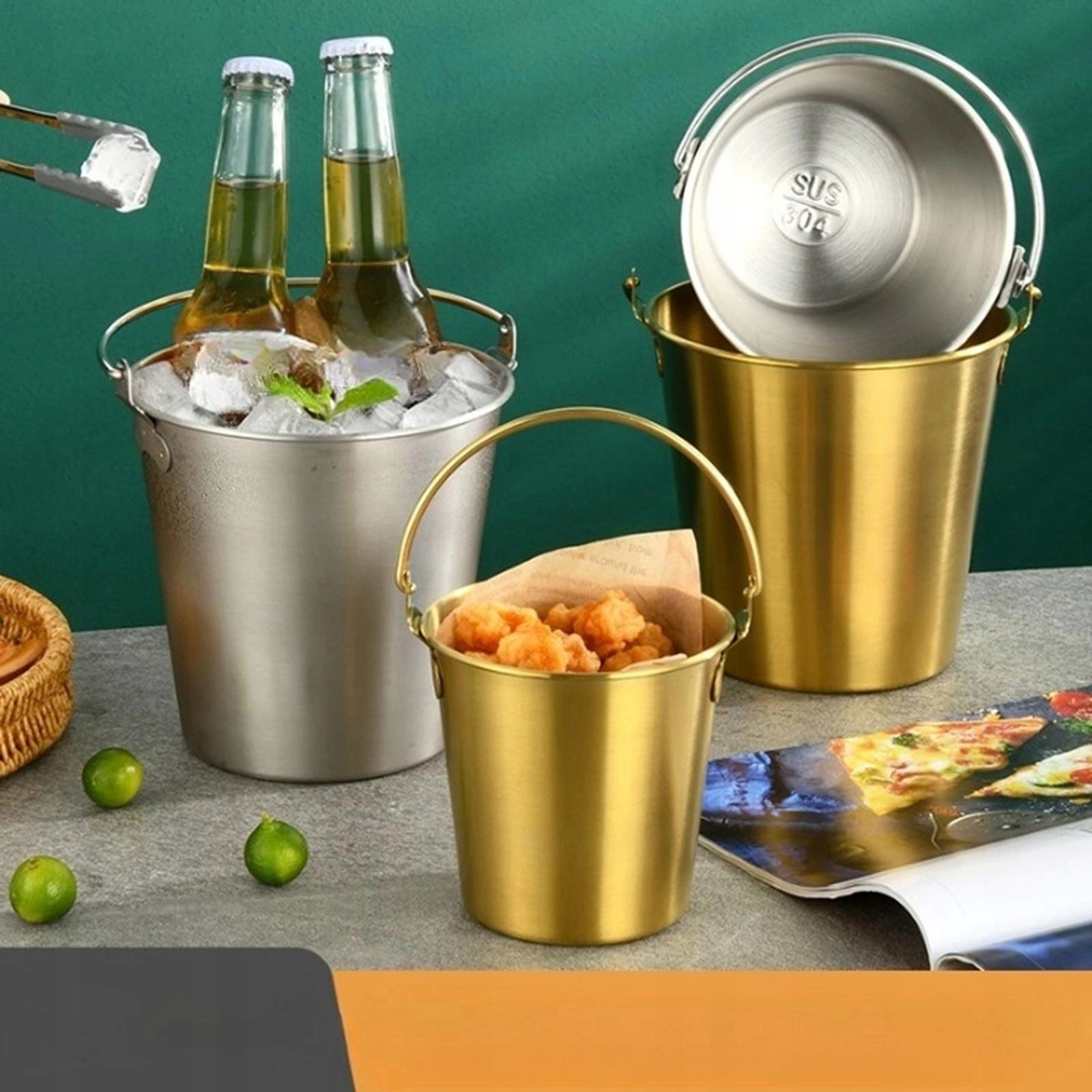 [Uniwersalny]: To wiadro do szampana może również służyć jako wiadro do serwowania, np. przygotowywania małych przekąsek, wiadra do sałatek, pojemnika na frytki i nie tylko.