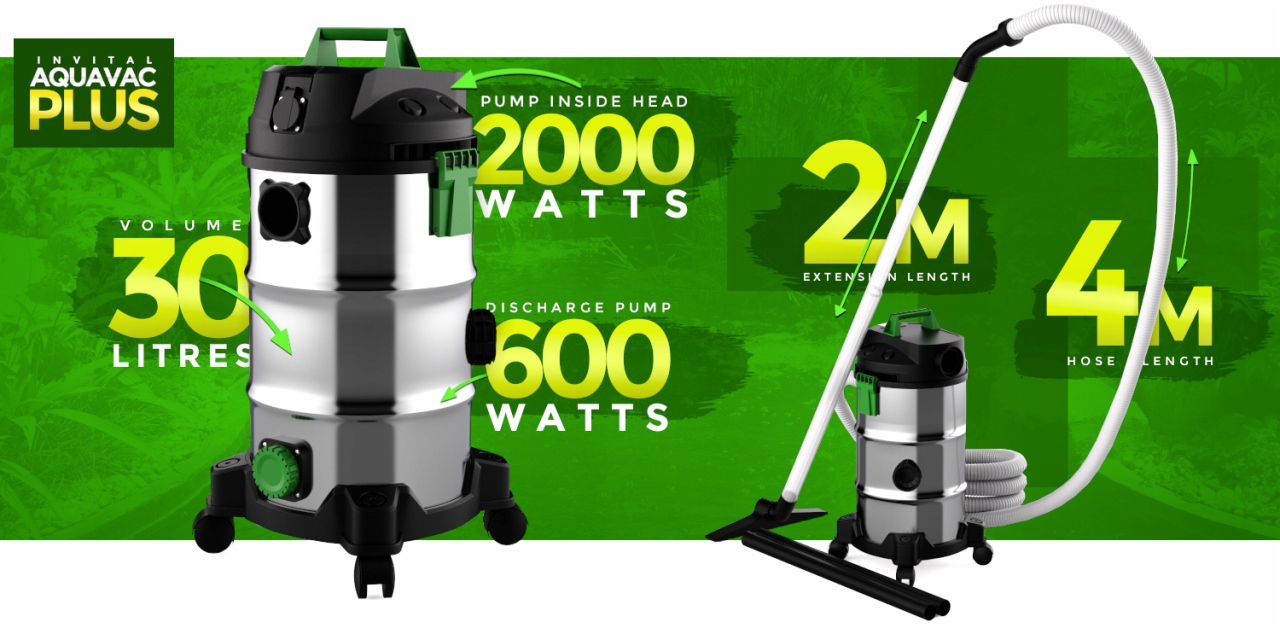 INVITAL AquaVac Plus ✅ to niezawodna pomoc podczas czyszczenia i konserwacji Twojego oczka wodnego. Łatwa obsługa, wysoka wydajność i bezproblemowa praca - to główne cechy prezentowanego odkurzacza. Z łatwością usunie ze zbiornika szlam, glony, osady z dna czy obumarłe rośliny. Wspomniana wyżej moc 2000W w połączeniu z wynoszącą 600W mocą pompy pomocniczej umożliwiają ciągłą pracę bez konieczności opróżniania zbiornika.