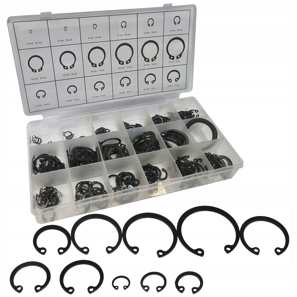Komplet 300 wewnętrznych i zewnętrznych pierścieni Segera. Pierścienie trzymają dobrze, są wykonane z trwałej sprężystej stali. Różnorodność rozmiarów w zestawie daje pewność, że znajdziemy odpowiedni, potrzebny rozmiar. Zestaw znajduje zastosowanie w każdym profesjonalnym warsztacie.
