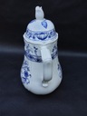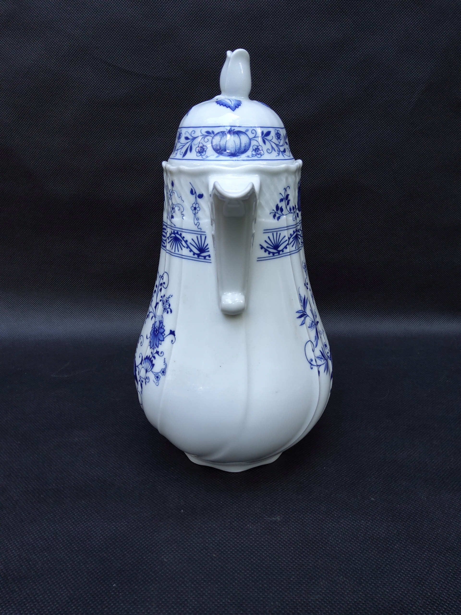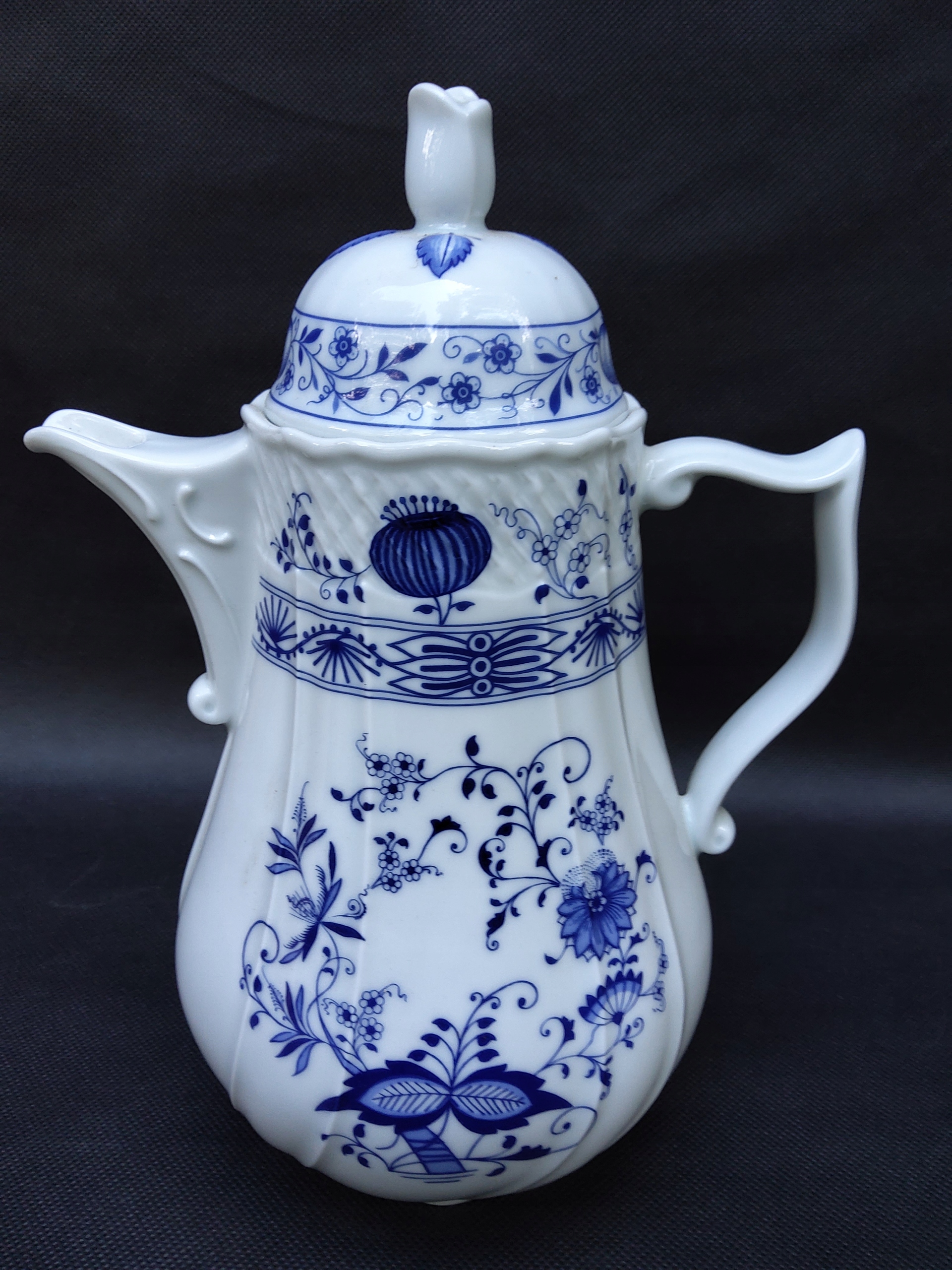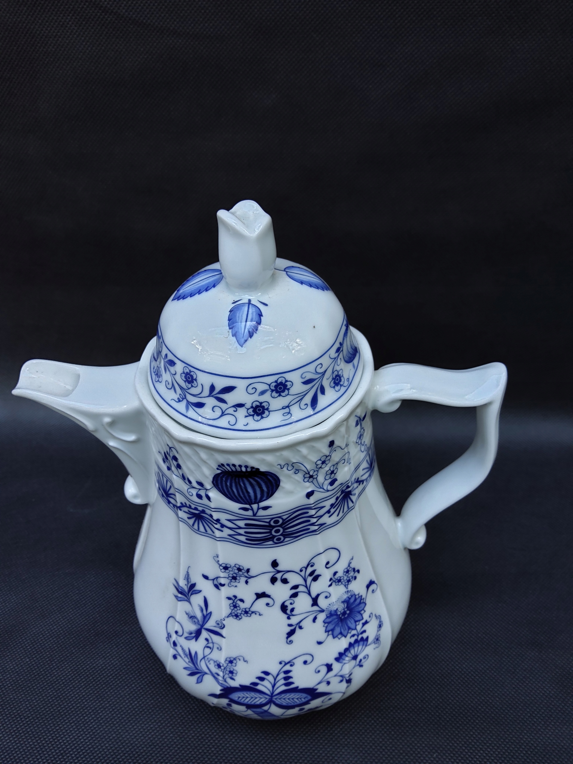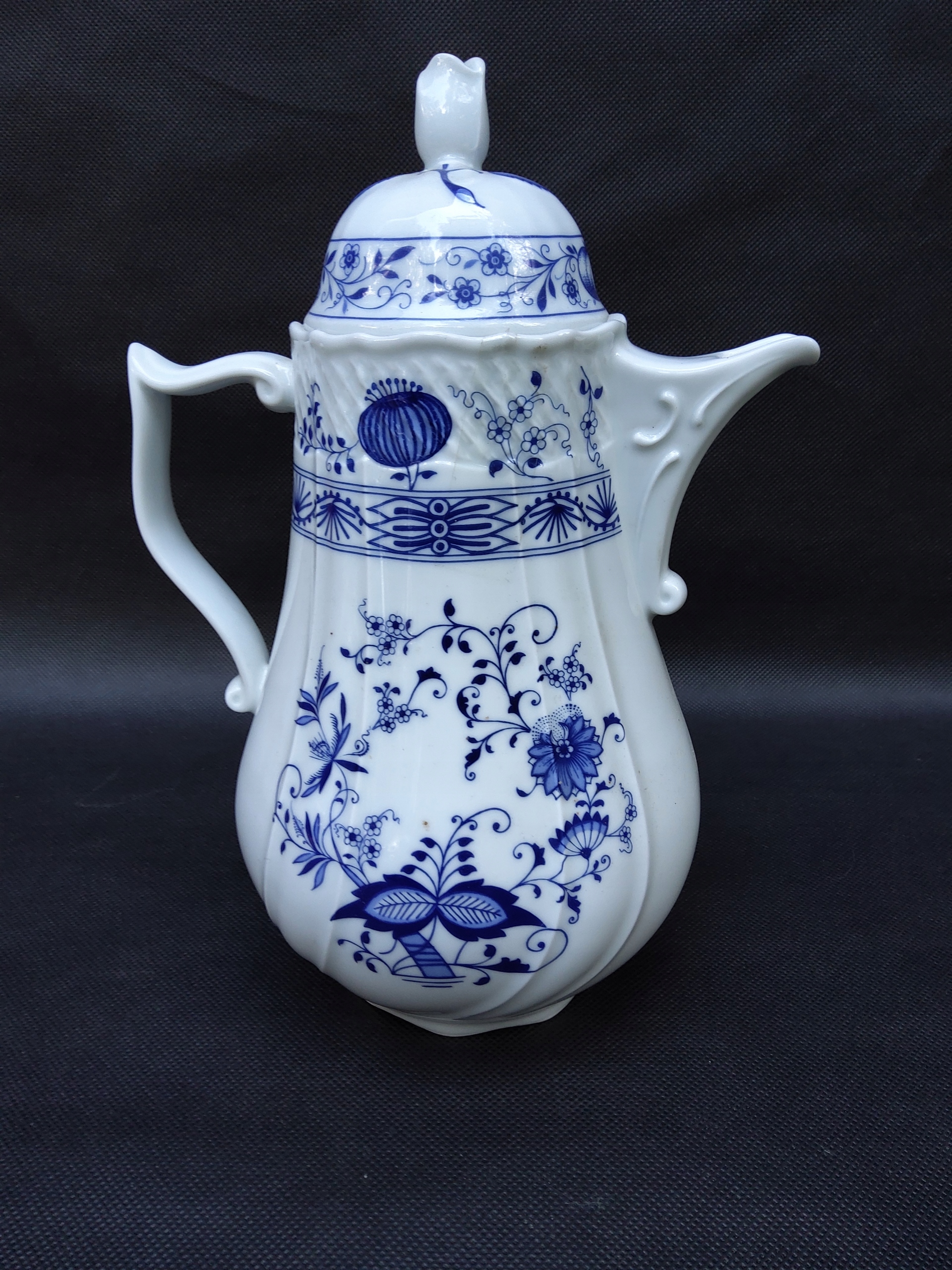 Porcelanowy dzbanek z wytwórni Schirnding.Biała porcelana zdobiona podszkliwnie kobaltowym wzorem cebulowym oraz wypukłymi reliefami.Pokrywka zakończona sterczynkà.Bardzo dobry stan,bez wad.Wysokość z pokrywkà 27cm.Polecam.