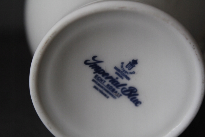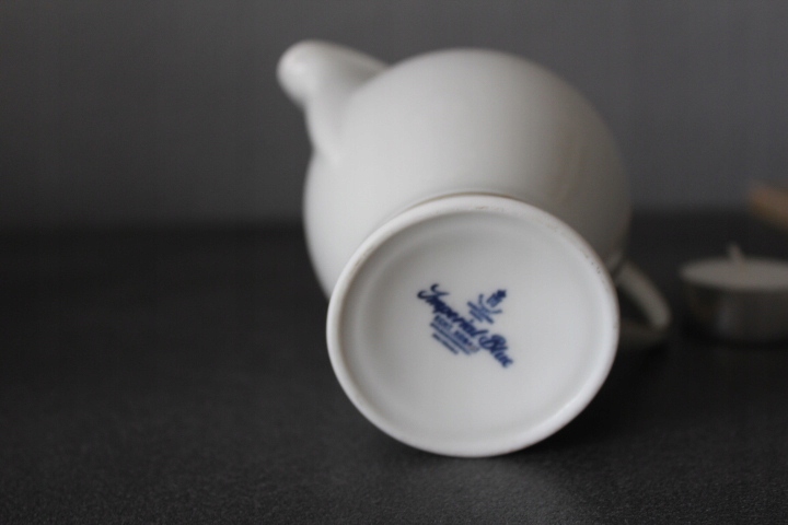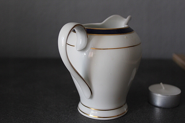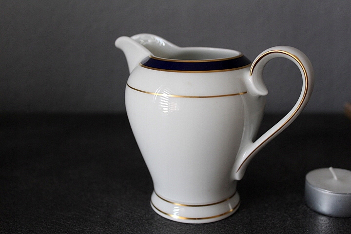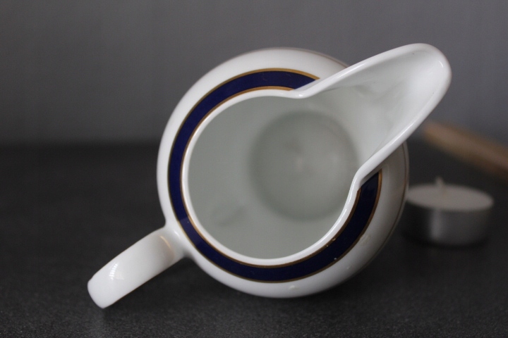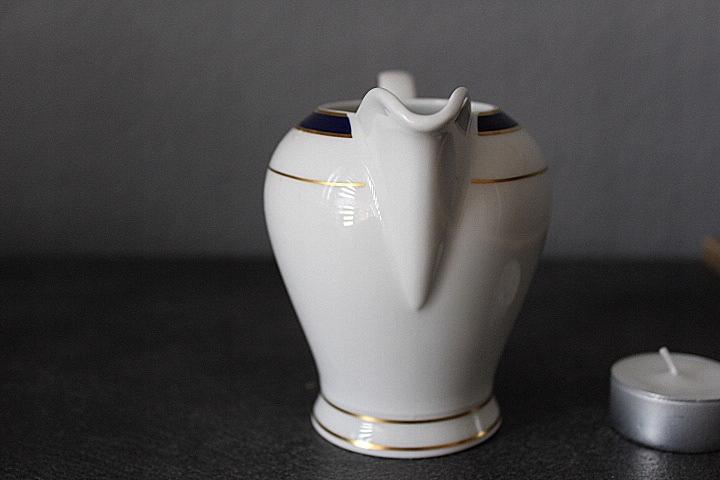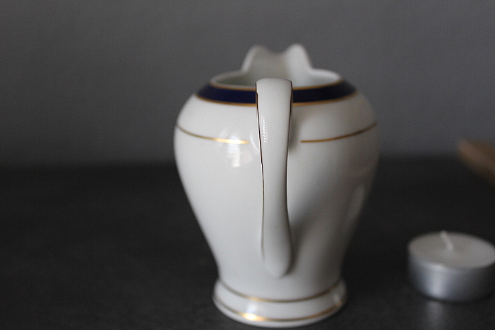 KLASYCZNY, ELEGANCKI MLECZNIK,BIAŁA WYSOKOGATUNKOWA PORCELANA, ZŁOCENIA, KOBALTOWE ZDOBIENIE