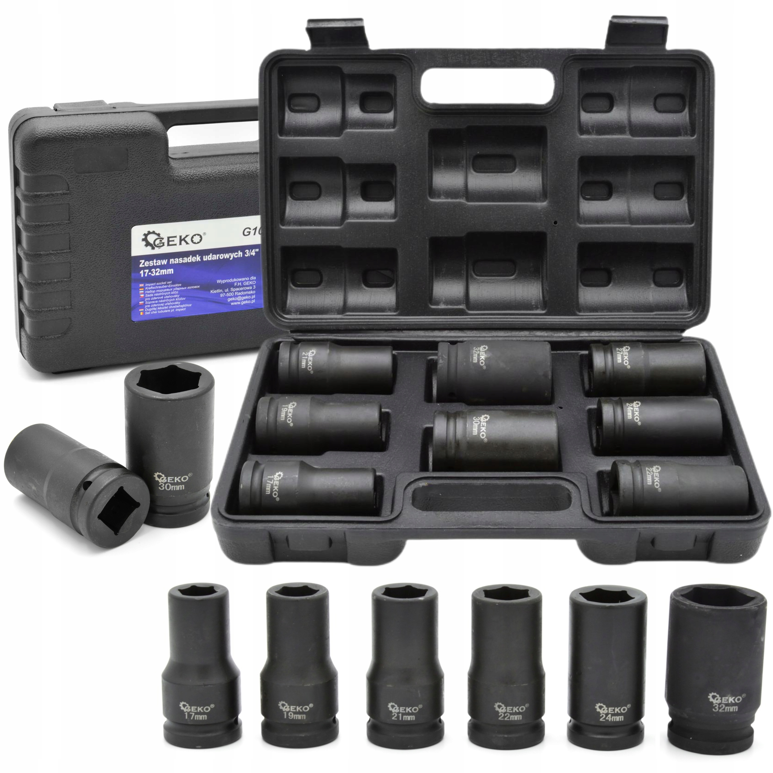Zestaw nasadek udarowych 3/4". W komplecie 8 nasadek zapakowanych w walizkę z tworzywa sztucznego.