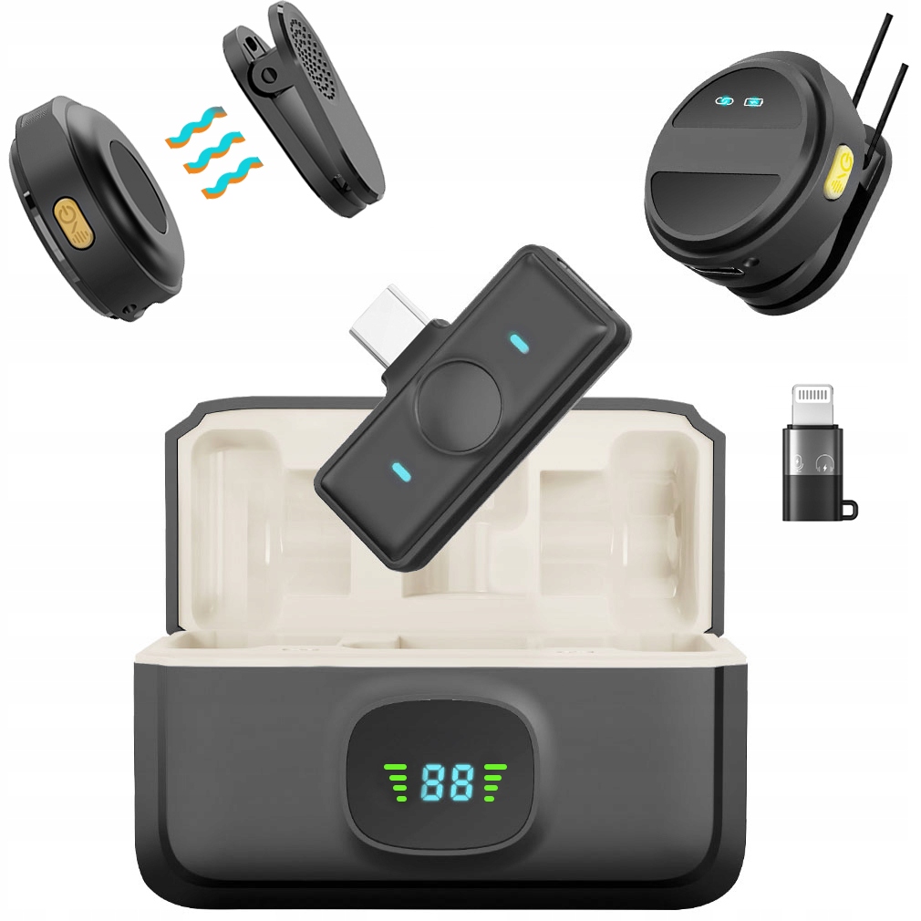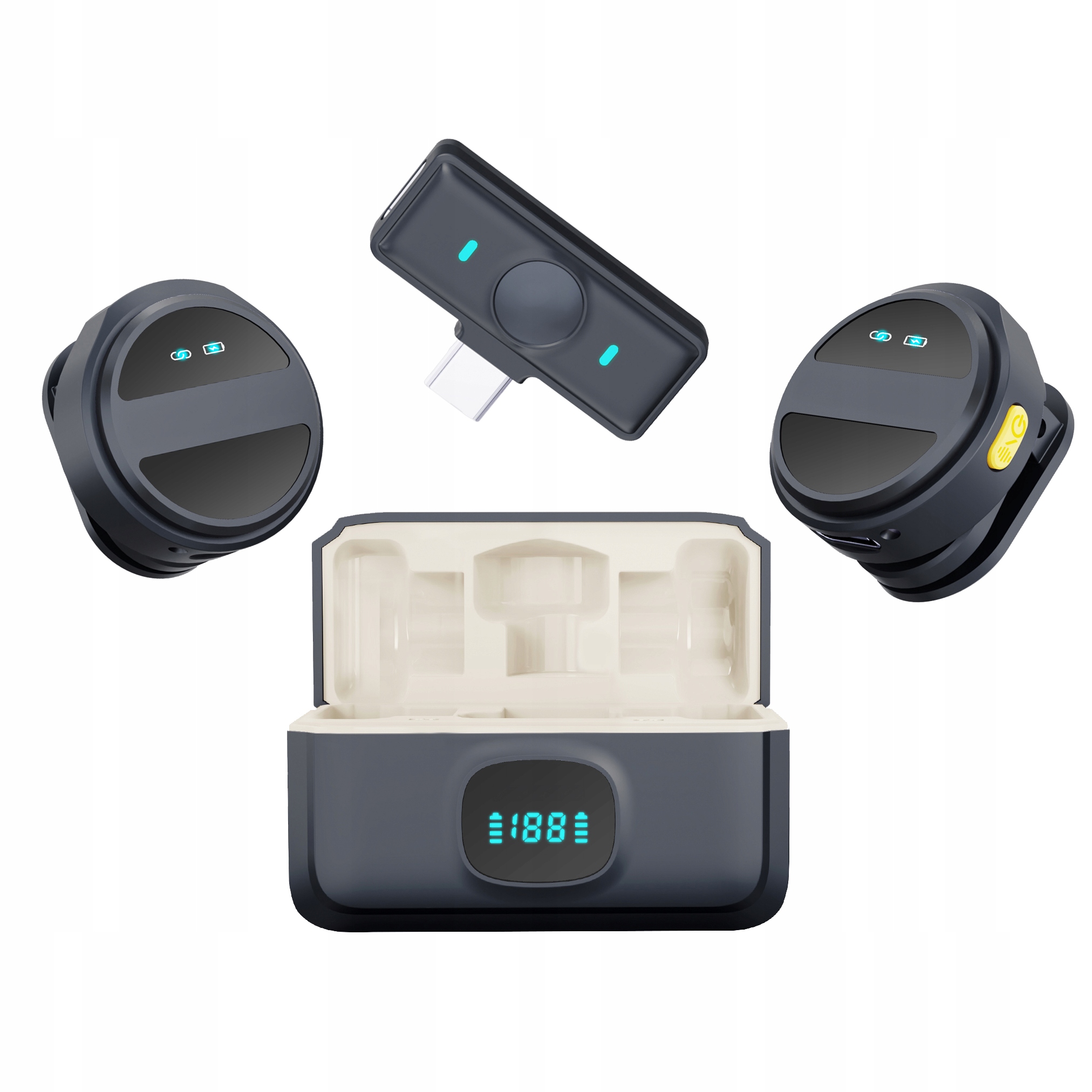 ✔️ W zestawie znajdują się dwa mikrofony bezprzewodowe z wbudowanym akumulatorem oraz powerbank 880mAh, zapewniający długotrwałe działanie.