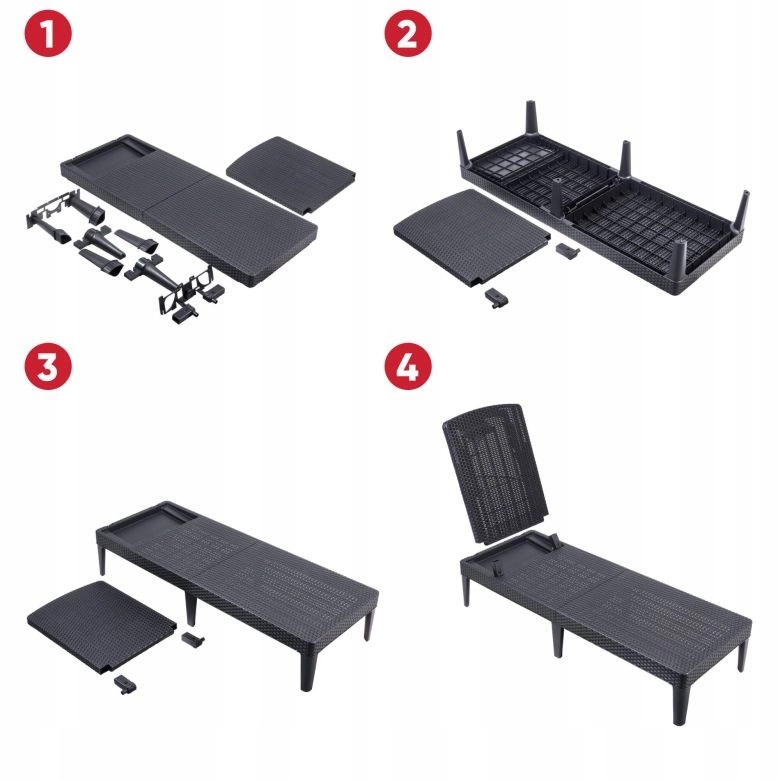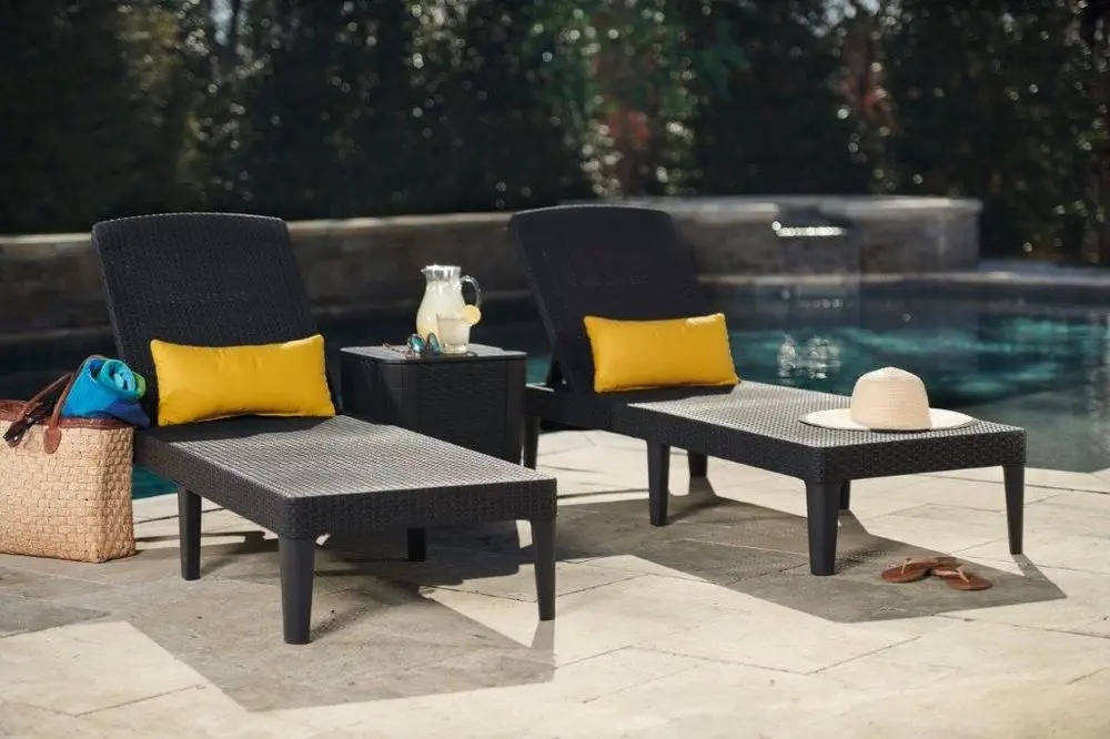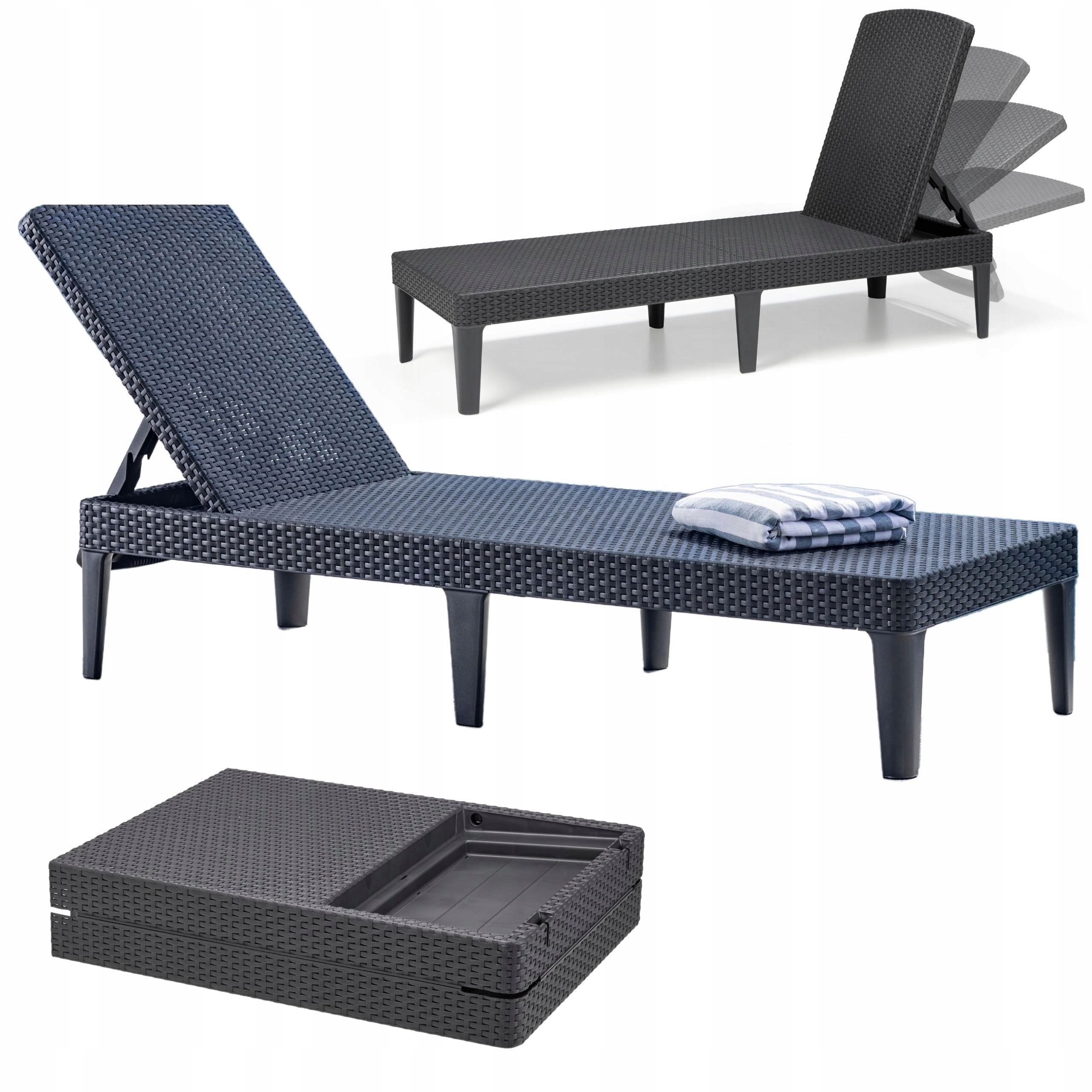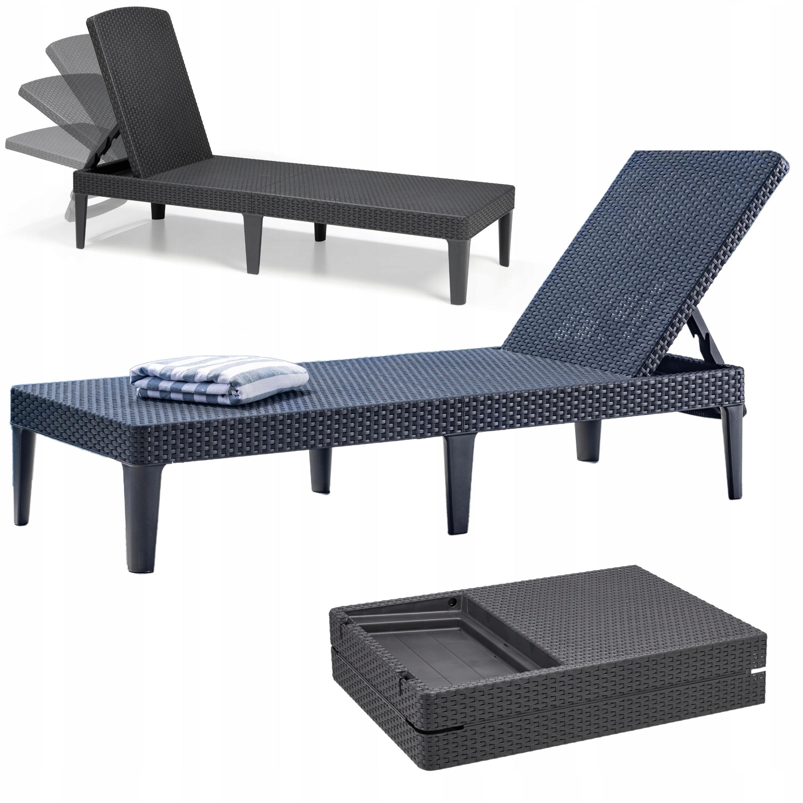 Grafitowe leżaki plażowe i ogrodowe Keter zachwycą Cię swoim prostym i nowoczesnym designem. Powierzchnia przypomina swoją strukturą naturalny rattan, jednak z tym produktem nie musisz obawiać się wiatru, deszczu czy promieniowania UV.
