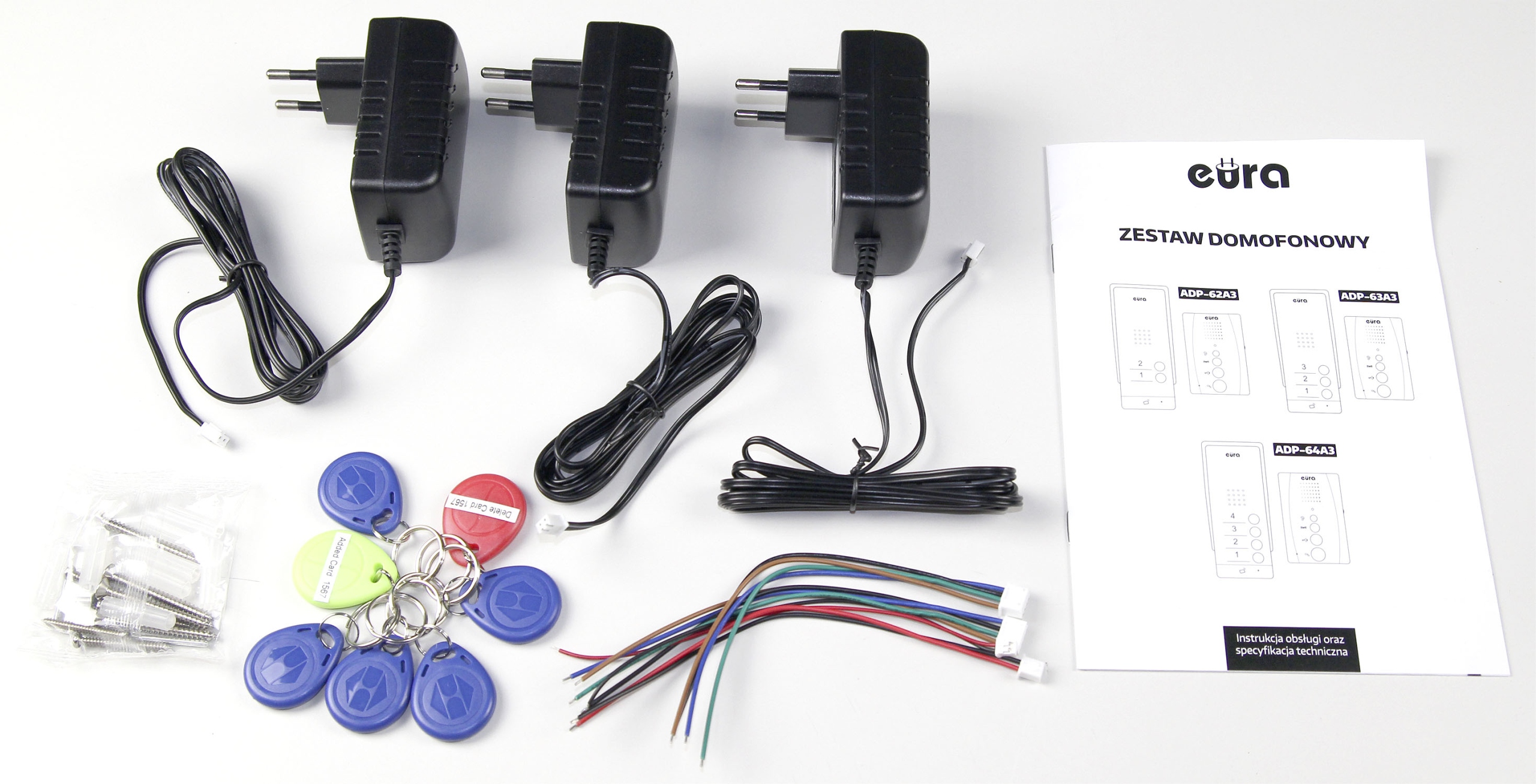 Dwurodzinny domofon wyposażony jest w 2 grafitowe unifony, srebrną kasetę zewnętrzną oraz 3 zasilacze sieciowe DC 12V.