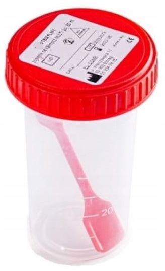 Zastosowanie: Pojemnik na mocz i kał jest jednokrotnego użycia, używany do pobierania próbki do analizy. Każdy pojemniczek mieści 60ml kału lub moczu. Szczelny po dokładnym zatrzaśnięciu nakrętki. Wykonany z plastiku. Sterylny.