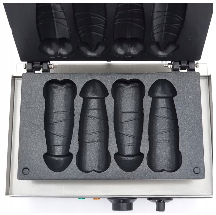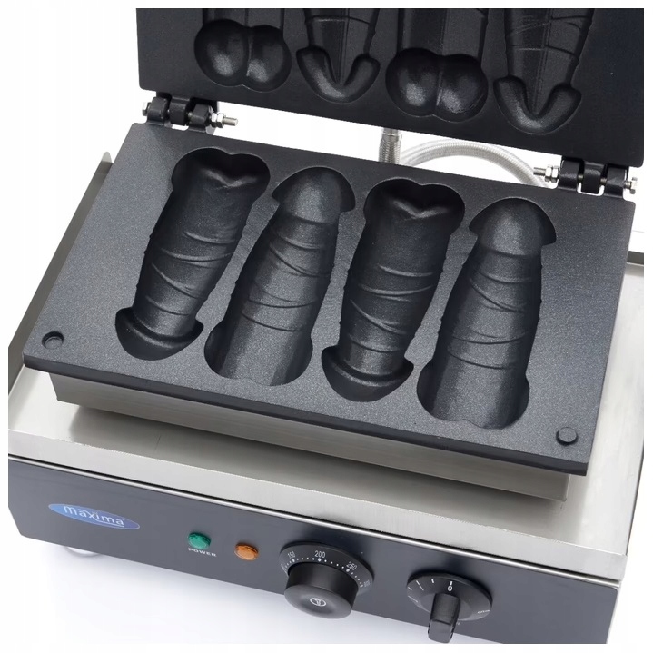 gofra w kształcie penisa. Dzięki tej wysokiej jakości elektrycznej gofrownicy możesz stworzyć jednocześnie cztery pyszne gofry w kształcie penisa. Stanowią one wspaniałą imprezową przekąskę